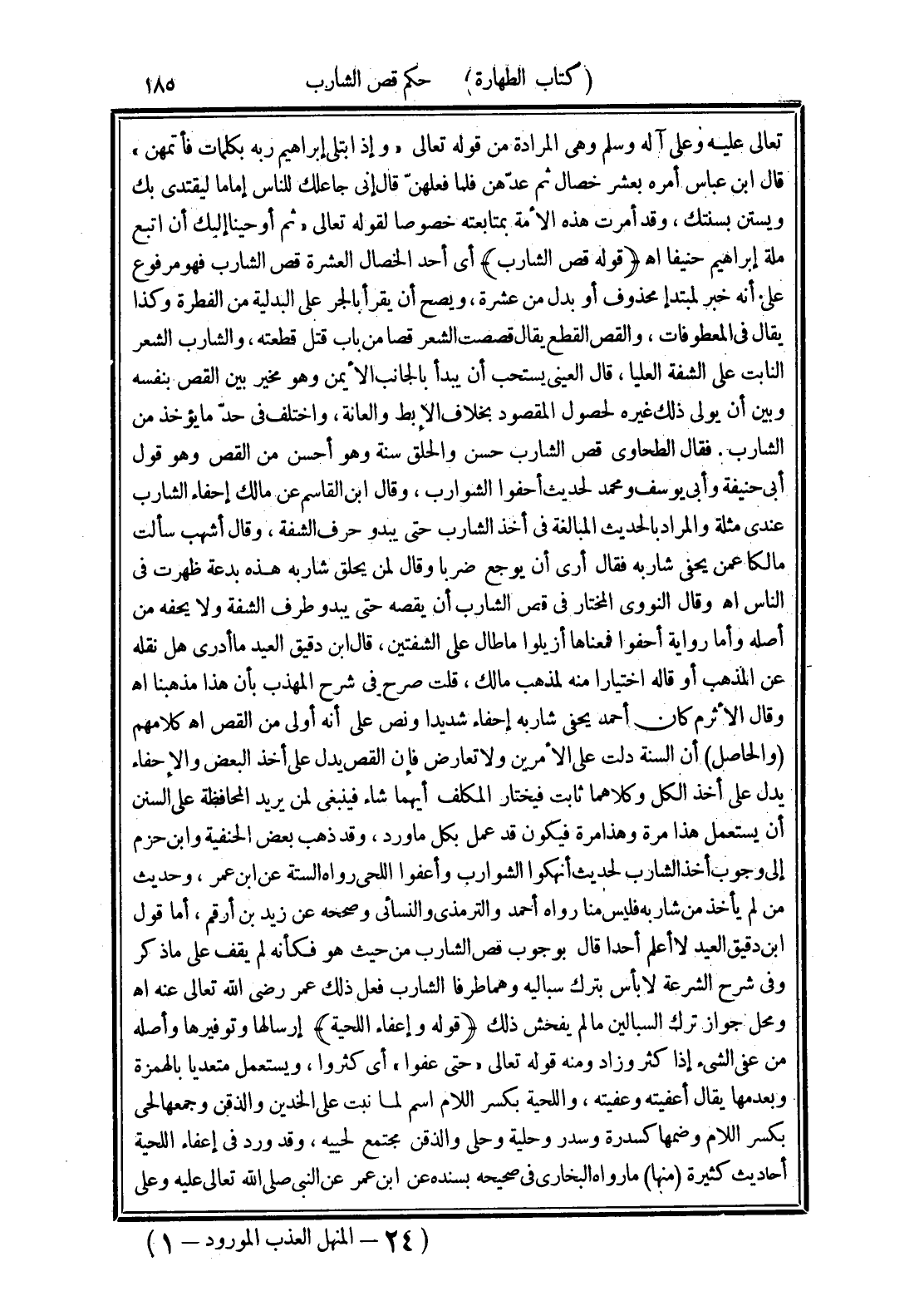 (قوله قص الشارب) أى أحد الخصال العشرة قص الشارب فهو مرفوع على أنه خبر لمبتدإ محذوف أو بدل من عشرة، ويصح أن يقرأ بالجر على البدلية من الفطرة وكذا يقال في المعطوفات، والقص القطع يقال قصصت الشعر قصا من باب قتل قطعته، والشارب الشعر النابت على الشفة العليا، قال العيني يستحب أن يبدأ بالجانب الأيمن وهو مخير بين القص بنفسه وبين أن يولى ذلك غيره لحصول المقصود بخلاف الإبط والعانة، واختلف في حد ما يؤخذ من الشارب. فقال الطحاوي قص الشارب حسن والحلق سنة وهو أحسن من القص وهو قول أبي حنيفة وأبي يوسف ومحمد لحديث أحفوا الشوارب، وقال ابن القاسم عن مالك إحفاء الشارب عندى مثلة والمراد بالحديث المبالغة في أخذ الشارب حتى يبدو حرف الشفة، وقال أشهب سألت مالكا عمن يحفى شاربه فقال أرى أن يوجع ضربا وقال لمن يحلق شاربه هذه بدعة ظهرت في الناس اهـ وقال النووى المختار في قص الشارب أن يقصه حتى يبدو طرف الشفة ولا يحفه من أصله وأما رواية أحفوا فعناها أزيلوا ما طال على الشفتين، قال ابن دقيق العيد ما أدري هل نقله عن المذهب أو قاله اختيارا منه لمذهب مالك، قلت صرح في شرح المهذب بأن هذا مذهبنا اهـ وقال الأثرم كان أحمد يحفي شاربه إحفاء شديدا ونص على أنه أولى من القص اهـ كلامهم (والحاصل) أن السنة دلت على الأمرين ولا تعارض فإن القص يدل على أخذ البعض والإحفاء يدل على أخذ الكل وكلاهما ثابت فيختار المكلف أيهما شاء فينبغى لمن يريد المحافظة على السنن أن يستعمل هذا مرة وهذا مرة فيكون قد عمل بكل ما ورد، وقد ذهب بعض الحنفية وابن حزم إلى وجوب أخذ الشارب لحديث أنهكوا الشوارب وأعفوا اللحى رواه الستة عن ابن عمر، وحديث من لم يأخذ من شاربه فليس منا رواه أحمد والترمذي والنسائي وصححه عن زيد بن أرقم، أما قول ابن دقيق العيد لا أعلم أحدا قال بوجوب قص الشارب من حيث هو فكأنه لم يقف على ما ذ كر وفى شرح الشرعة لا بأس بترك سباليه وهما طرفا الشارب فعل ذلك عمر رَضِيَ اللَّهُ تَعَالَى عَنْهُ اهـ ومحل جواز ترك السبالين ما لم يفحش ذلك