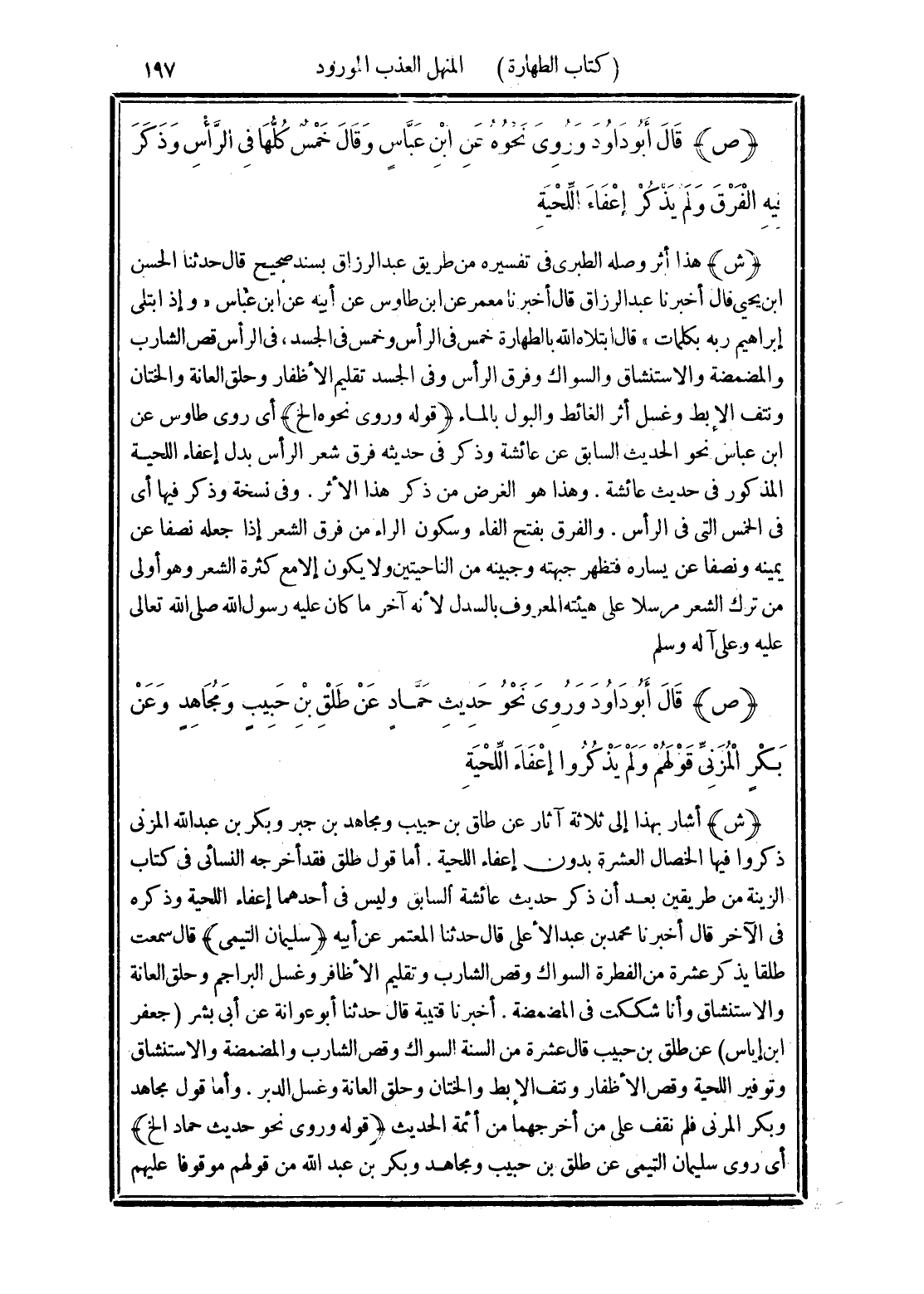 (ص) قَالَ أَبُو دَاوُدَ: وَرُوِيَ نَحْوُ حَدِيثِ حَمَّادٍ، عَنْ طَلْقِ بْنِ حَبِيبٍ، وَمُجَاهِدٍ، وَعَنْ بَكْرِ الْمُزَنِيِّ، قَوْلُهُمْ وَلَمْ يَذْكُرُوا إِعْفَاءَ اللِّحْيَةِ