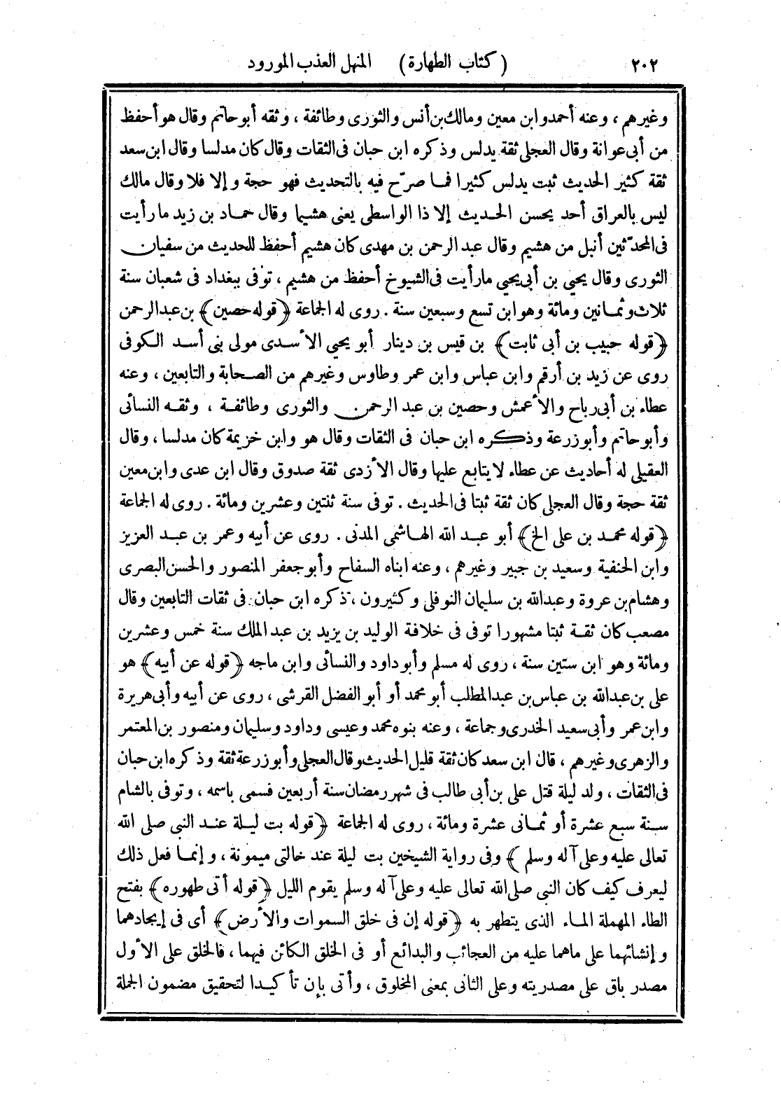 وغيرهم، وعنه أحمد وابن معين ومالك بن أنس والثورى وطائفة، وثقه أبو حاتم وقال هو أحفظ من أبي عوانة وقال العجلى ثقة يدلس وذكره ابن حبان في الثقات وقال كان مدلسا وقال ابن سعد ثقة كثير الحديث ثبت يدلس كثيرا فما صرّح فيه بالتحديث فهو حجة وإلا فلا وقال مالك ليس بالعراق أحد يحسن الحديث إلا ذا الواسطي يعني هشيما وقال حماد بن زيد ما رأيت في المحدّثين أنبل من هشيم وقال عبد الرحمن بن مهدي كان هشيم أحفظ للحديث من سفيان الثورى وقال يحيى بن أبي يحيى ما رأيت في الشيوخ أحفظ من هشيم، توفي ببغداد في شعبان سنة ثلاث وثمانين ومائة وهو ابن تسع وسبعين سنة. روى له الجماعة