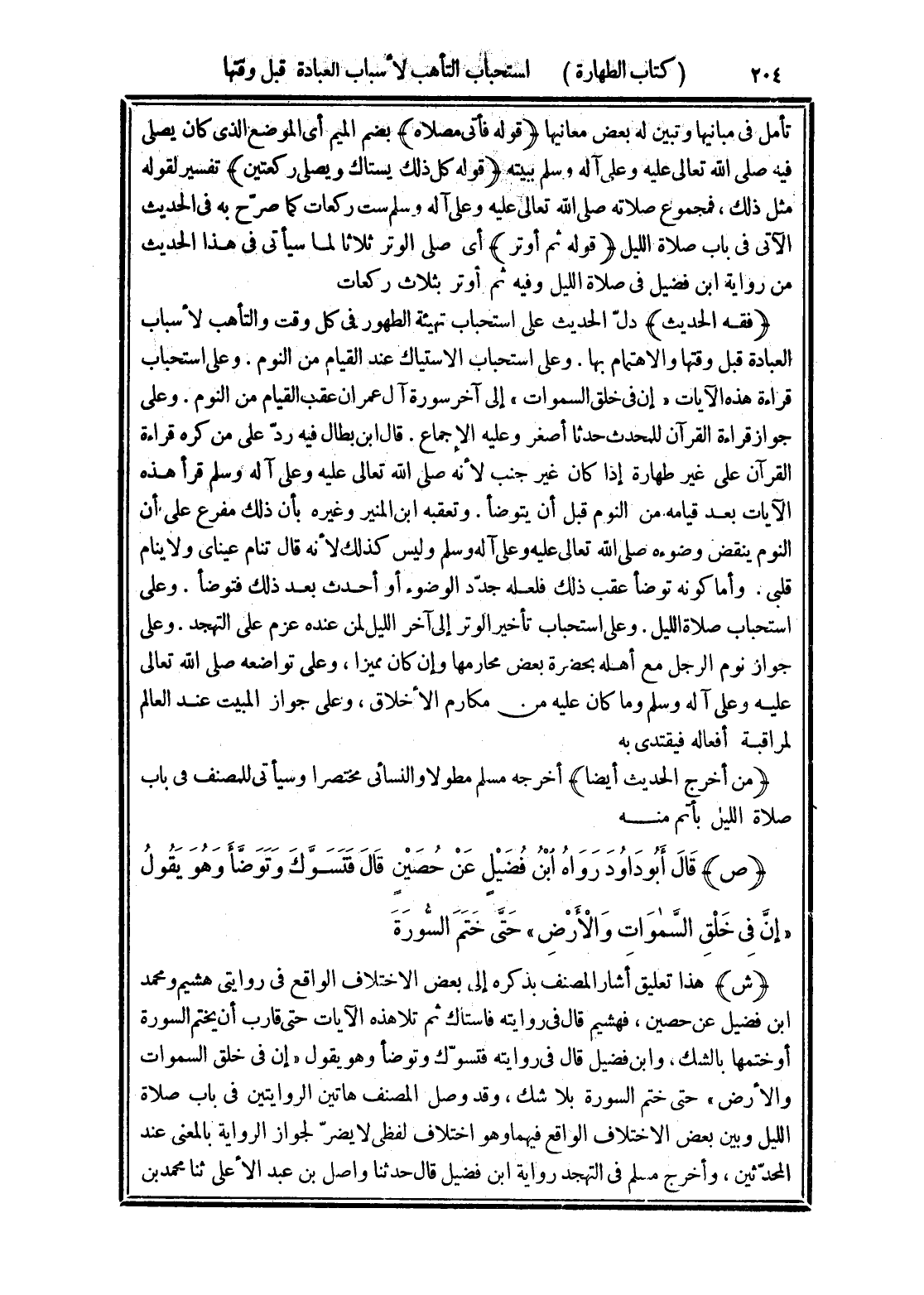 (فقه الحديث) دلّ الحديث على استحباب تهيئة الطهور في كل وقت والتأهب لأسباب العبادة قبل وقتها والاهتمام بها. وعلى استحباب الاستياك عند القيام من النوم. وعلى استحباب قراءة هذه الآيات "إن في خلق السموات" إلى آخر سورة آل عمران عقب القيام من النوم. وعلى جواز قراءة القرآن للمحدث حدثا أصغر وعليه الإجماع. قال ابن بطال فيه ردّ على من كره قراءة القرآن على غير طهارة إذا كان غير جنب لأنه صلى الله تعالى عليه وعلى آله وسلم قرأ هذه الآيات بعد قيامه من النوم قبل أن يتوضأ. وتعقبه ابن المنير وغيره بأن ذلك مفرع على أن النوم ينقض وضوءه صلى الله تعالى عليه وعلى آله وسلم وليس كذلك لأنه قال تنام عيناى ولا ينام قلبي. وأما كونه توضأ عقب ذلك فلعله جدد الوضوء أو أحدث بعد ذلك فتوضأ. وعلى استحباب صلاة الليل. وعلى استحباب تأخير الوتر إلى آخر الليل لمن عنده عزم على التهجد. وعلى جواز نوم الرجل مع أهله بحضرة بعض محارمها وإن كان مميزا، وعلى تواضعه صلى الله تعالى عليه وعلى آله وسلم وما كان عليه من مكارم الأخلاق، وعلى جواز المبيت عند العالم لمراقبة أفعاله فيقتدى به.