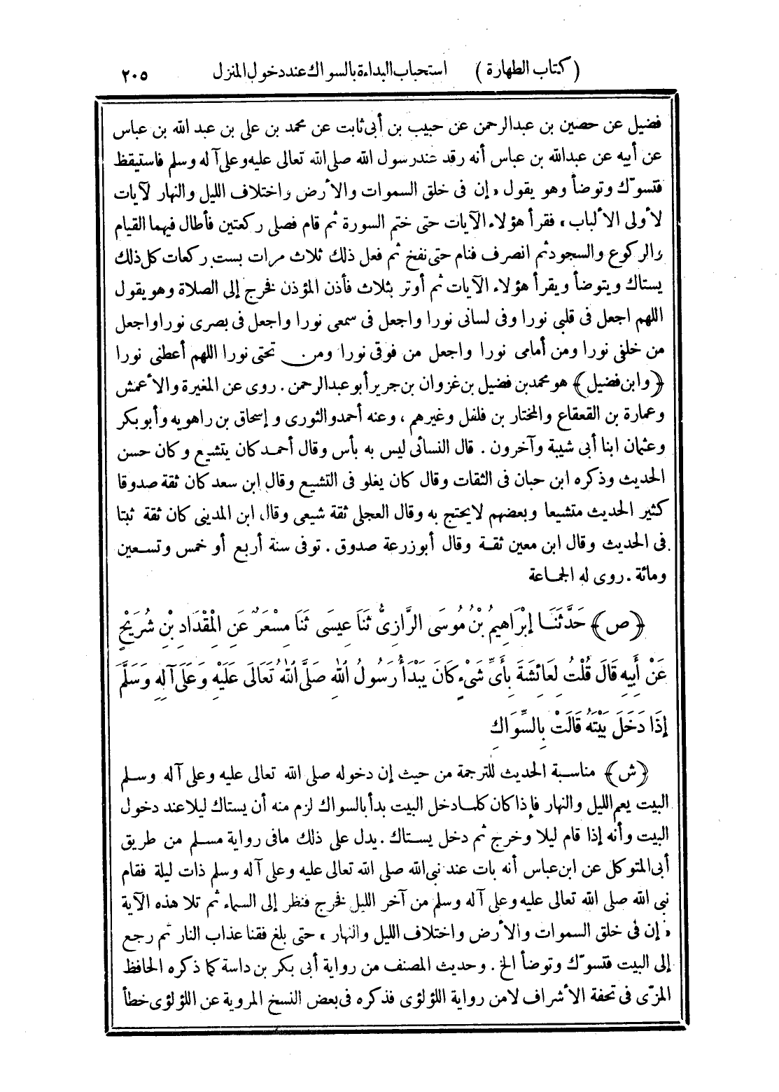 فضيل عن حصين بن عبد الرحمن عن حبيب بن أبي ثابت عن محمد بن على بن عبد الله بن عباس عن أبيه عن عبد الله بن عباس أنه رقد عند رسول الله صلى الله تعالى عليه وعلى آله وسلم فاستيقظ فتسوك وتوضأ وهو يقول "إن في خلق السموات والأرض واختلاف الليل والنهار لآيات لأولي الألباب" فقرأ هؤلاء الآيات حتى ختم السورة ثم قام فصلى ركعتين فأطال فيهما القيام والركوع والسجود ثم انصرف فنام حتى نفخ ثم فعل ذلك ثلاث مرات بست ركعات كل ذلك يستاك ويتوضأ ويقرأ هؤلاء الآيات ثم أوتر بثلاث فأذن المؤذن فخرج إلى الصلاة وهو يقول اللهم اجعل في قلبي نورا وفي لساني نورا واجعل في سمعى نورا واجعل في بصري نورا واجعل من خلفي نورا ومن أمامى نورا واجعل من فوفي نورا ومن تحتي نورا اللهم أعطني نورا (وابن فضيل) هو محمد بن فضيل بن غزوان بن جرير أبو عبد الرحمن. روى عن المغيرة والأعمش وعمارة بن القعقاع والمختار بن فلفل وغيرهم، وعنه أحمد والثوري وإسحاق بن راهوبه وأبو بكر وعثمان ابنا أبي شيبة وآخرون. قال النسائي ليس به بأس وقال أحمد كان يتشيع وكان حسن الحديث وذكره ابن حبان في الثقات وقال كان يغلو في التشيع وقال ابن سعد كان ثقة صدوقا كثير الحديث متشيعا وبعضهم لا يحتج به وقال العجلى ثقة شيعى وقال ابن المديني كان ثقة ثبتا في الحديث وقال ابن معين ثقة وقال أبو زرعة صدوق. توفى سنة أربع أو خمس وتسعين ومائة. روي له الجماعة