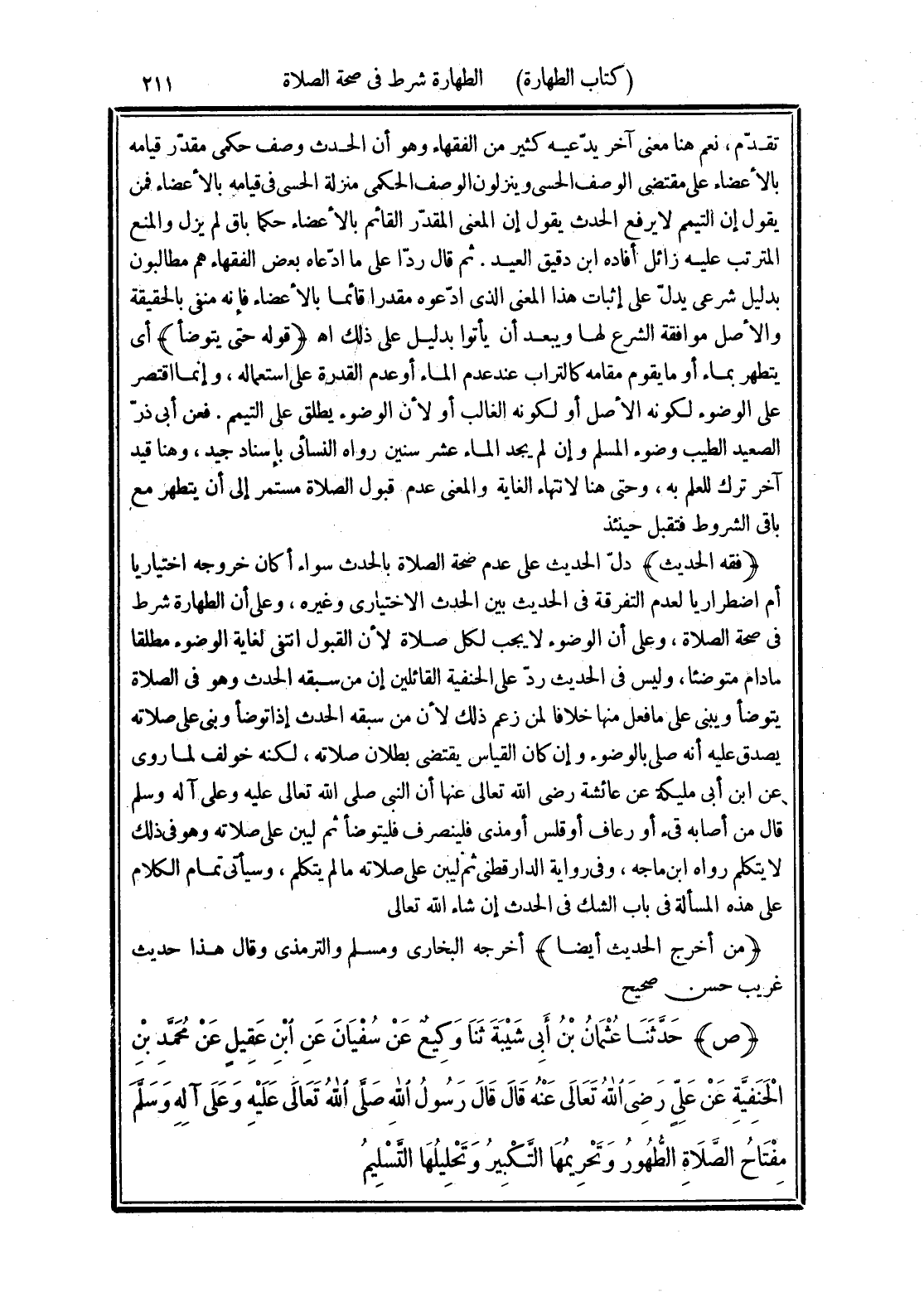 تقدّم، نعم هنا معنى آخر يدّعيه كثير من الفقهاء وهو أن الحدث وصف حكمى مقدّر قيامه بالأعضاء على مقتضى الوصف الحسى وينزلون الوصف الحكمى منزلة الحسي في قيامه بالأعضاء فمن يقول إن التيمم لا يرفع الحدث يقول إن المعنى المقدّر القائم بالأعضاء حكما باق لم يزل والمنع المترتب عليه زائل أفاده ابن دقيق العيد. ثم قال ردّا على ما ادّعاه بعض الفقهاء هم مطالبون بدليل شرعي يدل على إثبات هذا المعنى الذي ادّعوه مقدرا قائما بالأعضاء فإنه منفى بالحقيقة والأصل موافقة الشرع لها ويبعد أن يأتوا بدليل على ذلك اهـ