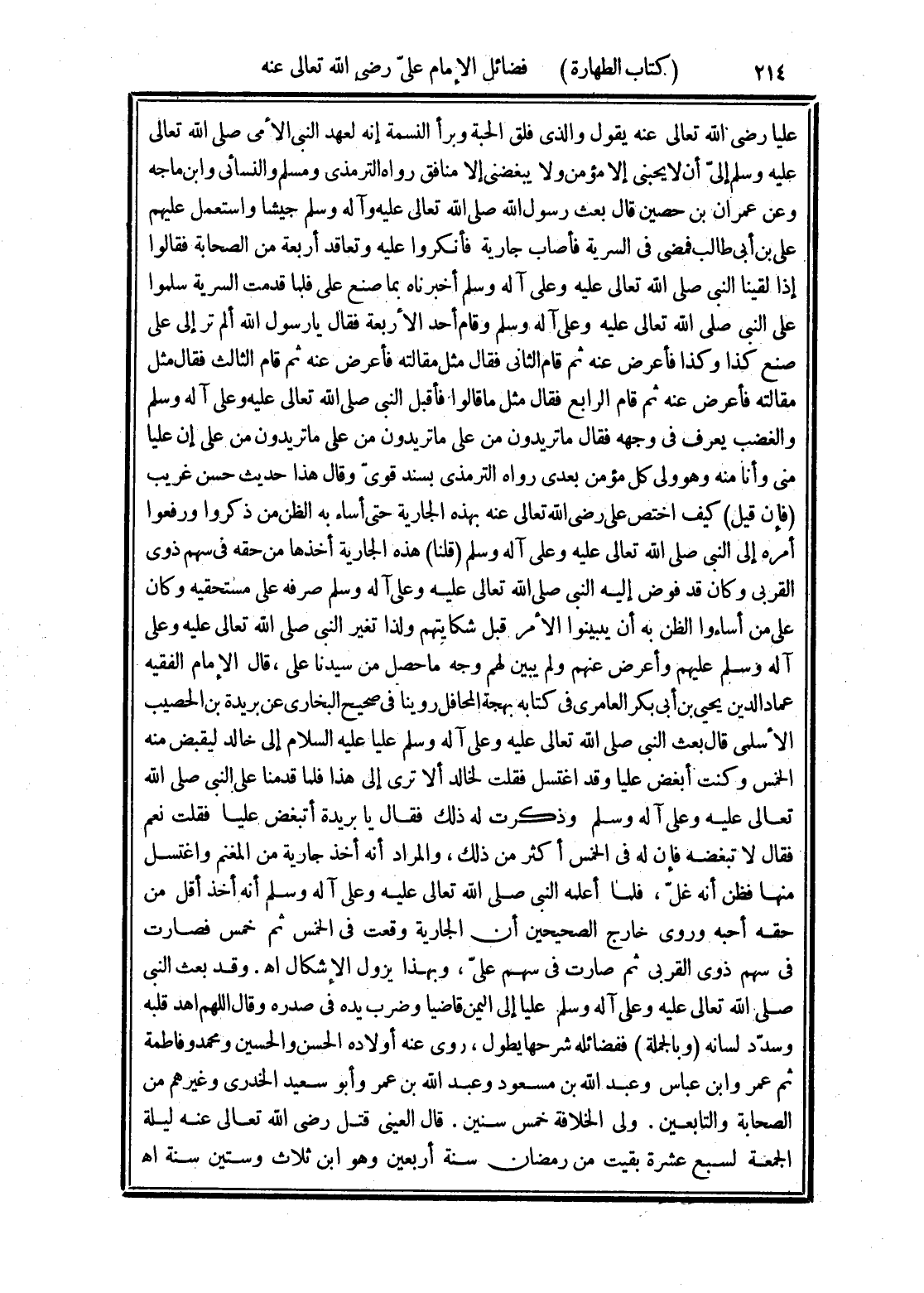 عليا رَضِيَ اللَّهُ تَعَالَى عَنْهُ يقول والذى فلق الحبة وبرأ النسمة إنه لعهد النبي الأمي صلى الله تعالى عليه وسلم إليّ أن لا يحبني إلا مؤمن ولا يبغضني إلا منافق رواه الترمذى ومسلم والنسائى وابن ماجه وعن عمران بن حصين قال بعث رسول الله صلى الله تعالى عليه وآله وسلم جيشا واستعمل عليهم على بن أبي طالب فمضى في السرية فأصاب جارية فأنكروا عليه وتعاقد أربعة من الصحابة فقالوا إذا لقينا النبي صلى الله تعالى عليه وعلى آله وسلم أخبرناه بما صنع على فلما قدمت السرية سلموا على النبي صلى الله تعالى عليه وعلى آله وسلم وقام أحد الأربعة فقال يا رسول الله ألم تر إلى علي صنع كذا وكذا فأعرض عنه ثم قام الثاني فقال مثل مقالته فأعرض عنه ثم قام الثالث فقال مثل مقالته فأعرض عنه ثم قام الرابع فقال مثل ما قالوا فأقبل النبي صلى الله تعالى عليه وعلى آله وسلم والغضب يعرف في وجهه فقال ما تريدون من على ما تريدون من على ما تريدون من على إن عليا مني وأنا منه وهو ولي كل مؤمن بعدى رواه الترمذى بسند قوى وقال هذا حديث حسن غريب (فإن قيل) كيف اختص على رَضِيَ اللَّهُ تَعَالَى عَنْهُ بهذه الجارية حتى أساء به الظن من ذكروا ورفعوا أمره إلى النبى صلى الله تعالى عليه وعلى آله وسلم (قلنا) هذه الجارية أخذها من حقه في سهم ذوى القربى وكان قد فوض إليه النبي صلى الله تعالى عليه وعلى آله وسلم صرفه على مستحقيه وكان على من أساءوا الظن به أن يبينوا الأمر قبل شكايتهم ولذا تغير النبي صلى الله تعالى عليه وعلى آله وسلم عليهم وأعرض عنهم ولم يبين لهم وجه ما حصل من سيدنا على، قال الإمام الفقيه عماد الدين يحيى بن أبي بكر العامرى في كتابه بهجة المحافل روينا في صحيح البخارى عن بريدة بن الحصيب الأسلمى قال بعث النبي صلى الله تعالى عليه وعلى آله وسلم عليا عليه السلام إلى خالد ليقبض منه الخمس وكنت أبغض عليا وقد اغتسل فقلت لخالد ألا ترى إلى هذا فلما قدمنا على النبي صلى الله تعالى عليه وعلى آله وسلم وذكرت له ذلك فقال يا بريدة أتبغض عليا فقلت نعم فقال لا تبغضه فإن له في الخمس أكثر من ذلك، والمراد أنه أخذ جارية من المغنم واغتسل منها ظن أنه غلّ، فلما أعلمه النبى صلى الله تعالى عليه وعلى آله وسلم أنه أخذ أقل من حقه أحبه وروى خارج الصحيحين أن الجارية وقعت في الخمس ثم خمس فصارت في سهم ذوى القربى ثم صارت في سهم عليّ، وبهذا يزول الإشكال اهـ. وقد بعث النبي صلى الله تعالى عليه وعلى آله وسلم عليا إلى اليمن قاضيا وضرب يده في صدره وقال اللهم اهد قلبه وسدّد لسانه (وبالجملة) ففضائله شرحها يطول، روى عنه أولاده الحسن والحسين ومحمد وفاطمة ثم عمر وابن عباس وعبد الله بن مسعود وعبد الله بن عمر وأبو سعيد الخدرى وغيرهم من الصحابة والتابعين. ولي الخلافة خمس سنين. قال العيني قتل رَضِيَ اللَّهُ تَعَالَى عَنْهُ ليلة الجمعة لسبع عشرة بقيت من رمضان سنة أربعين وهو ابن ثلاث وستين سنة اهـ