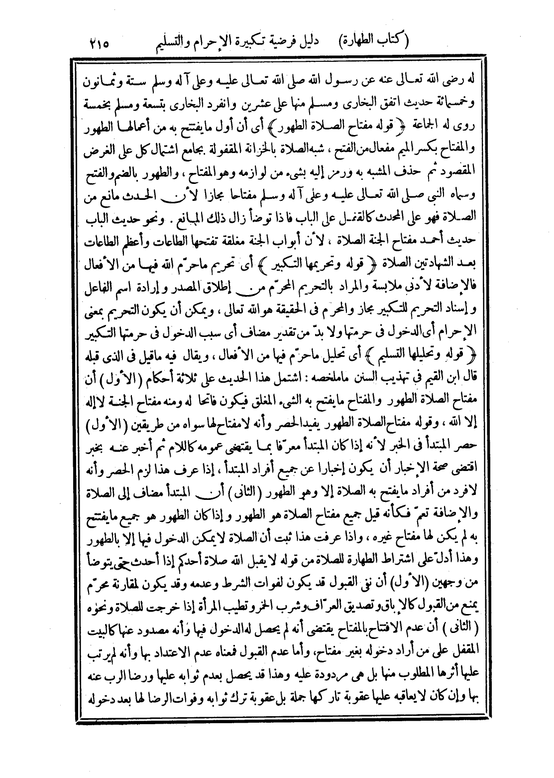 (قوله وتحريمها التكبير) أى تحريم ما حرّم الله فيها من الأفعال فالإضافة لأدنى ملابسة والمراد بالتحريم المحرّم من إطلاق المصدر وإرادة اسم الفاعل وإسناد التحريم للتكبير مجاز والمحرم في الحقيقة هو الله تعالى، ويمكن أن يكون التحريم بمعنى الإحرام أى الدخول في حرمتها ولا بدّ من تقدير مضاف أى سبب الدخول في حرمتها التكبير (قول وتحليلها التسليم) أى تحليل ما حرّم فيها من الأفعال، ويقال فيه ما قيل في الذى قبله قال ابن القيم في تهذيب السنن ما ملخصه: اشتمل هذا الحديث على ثلاثة أحكام (الأول) أن مفتاح الصلاة الطهور والمفتاح ما يفتح به الشئ المغلق فيكون فاتحا له ومنه مفتاح الجنة لا إله إلا الله، وقوله مفتاح الصلاة الطهور يفيد الحصر وأنه لا مفتاح لها سواه من طريقين (الأول) حصر المبتدأ في الخبر لأنه إذا كان المبتدأ معرّفا بما يقتضى عمومه كاللام ثم أخبر عنه بخبر اقتضى صحة الإخبار أن يكون إخبارا عن جميع أفراد المبتدأ، إذا عرف هذا لزم الحصر وأنه لافرد من أفراد ما يفتح به الصلاة إلا وهو الطهور (الثاني) أن المبتدأ مضاف إلى الصلاة والإضافة تعمّ فكأنه قيل جميع مفتاح الصلاة هو الطهور وإذا كان الطهور هو جميع ما يفتتح به لم يكن لها مفتاح غيره، وإذا عرفت هذا ثبت أن الصلاة لا يمكن الدخول فيها إلا بالطهور وهذا أدل على اشتراط الطهارة للصلاة من قوله لا يقبل الله صلاة أحدكم إذا أحدث حتى يتوضأ من وجهين (الأول) أن نفي القبول قد يكون لفوات الشرط وعدمه وقد يكون لمقارنة محرّم يمنع من القبول كالإباق وتصديق العرّاف وشرب الخمر وتطيب المرأة إذا خرجت للصلاة ونحوه (الثاني) أن عدم الافتتاح بالمفتاح يقتضى أنه لم يحصل له الدخول فيها وأنه مصدود عنها كالبيت المقفل على من أراد دخوله بغير مفتاح، وأما عدم القبول فمعناه عدم الاعتداد بها وأنه لم يرتب عليها أثرها المطلوب منها بل هي مردودة عليه وهذا قد يحصل بعدم ثوابه عليها ورضا الرب عنه بها وإن كان لا يعاقبه عليها عقوبة تاركها جملة بل عقوبة ترك ثوابه وفوات الرضا لها بعد دخوله