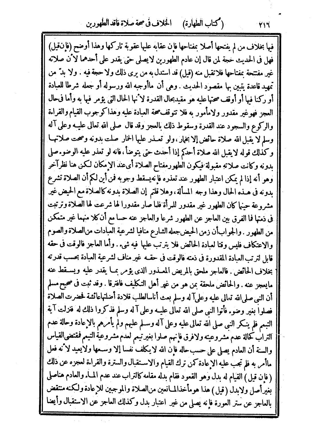 فيها بخلاف من لم يفتحها أصلا بمفتاحها فإن عقابه عليها عقوبة تاركها وهذا أوضح (فإن قيل) فهل في الحديث حجة لمن قال إن عادم الطهورين لا يصلى حتى يقدر على أحدهما لأن صلاته غير مفتتحة بمفتاحها فلا تقبل منه (قيل) قد استدل به من يرى ذلك ولا حجة فيه. ولا بدّ من تمهيد قاعدة يتبين بها مقصود الحديث. وهي أن ما أوجبه الله ورسوله أو جعله شرطا للعبادة أو ركنا فيها أو أوقف صحتها عليه هو مقيد بحال القدرة لأنها الحال التي يؤمر فيها به وأما في حال العجز فهو غير مقدور ولا مأمور به فلا تتوقف صحة العبادة عليه وهذا كوجوب القيام والقراءة والركوع والسجود عند القدرة وسقوط ذلك بالعجز وقد قال صلى الله تعالى عليه وعلى آله وسلم لا يقبل الله صلاة حائض إلا بخمار، ولو تعذر عليها الخمار صلت بدونه وصحت صلاتها وكذلك قوله لا يقبل الله صلاة أحدكم إذا أحدث حتى يتوضأ، فإنه لو تعذر عليه الوضوء صلى بدونه وكانت صلاته مقبولة فيكون الطهور مفتاح الصلاة أى عند الإمكان لكن هنا نظر آخر وهو أنه إذا لم يمكن اعتبار الطهور عند تعذره فإنه يسقط وجوبه فمن أين لكم أن الصلاة تشرع بدونه في هذه الحال وهذا وجه المسألة، وهلا قلتم إن الصلاة بدونه كالصلاة مع الحيض غير مشروعة حينما كان الطهور غير مقدور للمرأة فلما صار مقدورا لها شرعت لها الصلاة وترتبت في ذمتها فما الفرق بين العاجز عن الطهور شرعا والعاجز عنه حسا مع أن كلا منهما غير متمكن من الطهور. والجواب أن زمن الحيض جعله الشارع منافيا لشرعية العبادات من الصلاة والصوم والاعتكاف فليس وقتا لعبادة الحائض فلا يترتب عليها فيه شئ. وأما العاجز فالوقت في حقه قابل لترتب العبادة المقدورة في ذمته فالوقت في حقه غير مناف لشرعية العبادة بحسب قدرته بخلاف الحائض. فالعاجز ملحق بالمريض المعذور الذى يؤمر بما يقدر عليه ويسقط عنه ما يعجز عنه. والحائض ملحقة بمن هو من غير أهل التكليف فافترقا. وقد ثبت في صحيح مسلم أن النبي صلى الله تعالى عليه وعلى آله وسلم بعث أناسا لطلب قلادة أضلتها عائشة فحضرت الصلاة فصلوا بغير وضوء فأتوا النبى صلى الله تعالى عليه وعلى آله وسلم فذكروا ذلك له فنزلت آية التيمم فلم ينكر النبي صلى الله تعالى عليه وعلى آله وسلم عليهم ولم يأمرهم بالإعادة وحالة عدم التراب كحالة عدم مشروعيته ولا فرق فإنهم صلوا بغير تيمم لعدم مشروعية التيمم فمقتضى القياس والسنة أن العادم يصلى على حسب حاله فإن الله لا يكلف نفسا إلا وسعها ولا يعيد لأنه فعل ما أمر به فلم تجب عليه الإعادة كمن ترك القيام والاستقبال والسترة والقراءة لعجزه عن ذلك (فإن قيل) القيام له بدل وهو القعود فقام بدله مقامه كالتراب عند عدم الماء والعادم هنا صلى بغير أصل ولا بدل (قيل) هذا هو مأخذ المانعين من الصلاة والموجبين للإعادة ولكنه منتقض بالعاجز عن ستر العورة فإنه يصلى من غير اعتبار بدل وكذلك العاجز عن الاستقبال وأيضا