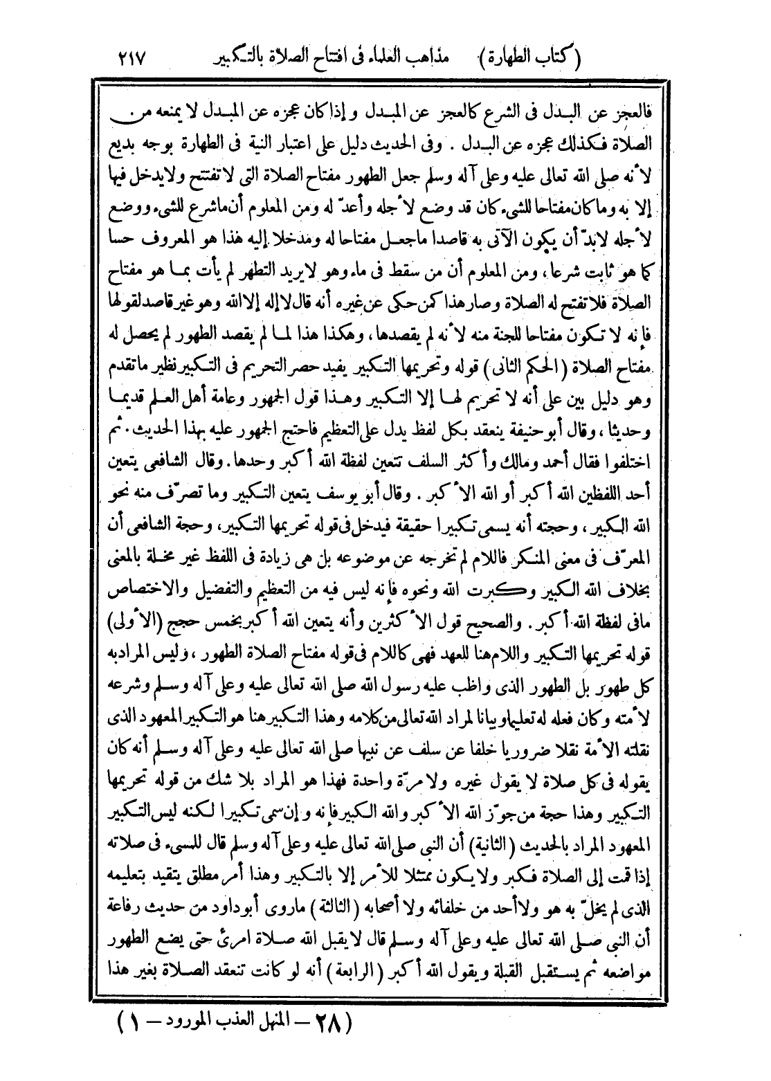 فالعجز عن البدل في الشرع كالعجز عن المبدل وإذا كان عجزه عن المبدل لا يمنعه من الصلاة فكذلك لعجزه عن البدل. وفي الحديث دليل على اعتبار النية في الطهارة بوجه بديع لأنه صلى الله تعالى عليه وعلى آله وسلم جعل الطهور مفتاح الصلاة التي لا تفتتح ولا يدخل فيها إلا به وما كان مفتاحا للشئ كان قد وضع لأجله وأعدّ له ومن المعلوم أن ما شرع للشئ ووضع لأجله لا بدّ أن يكون الآتي به قاصدا ما جعل مفتاحا له ومدخلا إليه هذا هو المعروف حسا كما هو ثابت شرعا، ومن المعلوم أن من سقط في ماء وهو لا يريد التطهر لم يأت بما هو مفتاح الصلاة فلا تفتح له الصلاة وصار هذا كمن حكى عن غيره أنه قال لا إله إلا الله وهو غير قاصد لقولها فإنه لا تكون مفتاحا للجنة منه لأنه لم يقصدها، وهكذا هذا لما لم يقصد الطهور لم يحصل له مفتاح الصلاة (الحكم الثاني) قوله وتحريمها التكبير يفيد حصر التحريم في التكبير نظير ما تقدم وهو دليل بين على أنه لا تحريم لها إلا التكبير وهذا قول الجمهور وعامة أهل العلم قديما وحديثا، وقال أبو حنيفة ينعقد بكل لفظ يدل على التعظيم فاحتج الجمهور عليه بهذا الحديث. ثم اختلفوا فقال أحمد ومالك وأكثر السلف تتعين لفظة الله أكبر وحدها. وقال الشافعى يتعين أحد اللفظين الله أكبر أو الله الأكبر. وقال أبو يوسف يتعين التكبير وما تصرّف منه نحو الله الكبير، وحجته أنه يسمى تكبيرا حقيقة فيدخل في قوله تحريمها التكبير، وحجة الشافعى أن المعرّف في معنى المنكر فاللام لم تخرجه عن موضوعه بل هى زيادة في اللفظ غير مخلة بالمعنى بخلاف الله الكبير وكبرت الله ونحوه فإنه ليس فيه من التعظيم والتفضيل والاختصاص ما في لفظه الله أكبر. والصحيح قول الأكثرين وأنه يتعين الله أكبر بخمس حجج (الأولى) قوله تحريمها التكبير واللام هنا للعهد فهى كاللام في قوله مفتاح الصلاة الطهور، وليس المراد به كل طهور بل الطهور الذي واظب عليه رسول الله صلى الله تعالى عليه وعلى آله وسلم وشرعه لأمته وكان فعله له تعليما وبيانا لمراد الله تعالى من كلامه وهذا التكبير هنا هو التكبير المعهود الذى نقلته الأمة نقلا ضروريا خلفا عن سلف عن نبيها صلى الله تعالى عليه وعلى آله وسلم أنه كان يقوله في كل صلاة لا يقول غيره ولا مرّة واحدة فهذا هو المراد بلا شك من قوله تحريمها التكبير وهذا حجة من جوّز الله الأكبر والله الكبير فإنه وإن سمى تكبيرا لكنه ليس التكبير المعهود المراد بالحديث (الثانية) أن النبي صلى الله تعالى عليه وعلى آله وسلم قال للمسيء في صلاته إذا قمت إلى الصلاة فكبر ولا يكون ممتثلا للأمر إلا بالتكبير وهذا أمر مطلق يتقيد بتعليمه الذي لم يخلّ به هو ولا أحد من خلفائه ولا أصحابه (الثالثة) ما روى أبو داود من حديث رفاعة أن النبي صلى الله تعالى عليه وعلى آله وسلم قال لا يقبل الله صلاة امرئ حتى يضع الطهور مواضعه ثم يستقبل القبلة ويقول الله أكبر (الرابعة) أنه لو كانت تنعقد الصلاة بغير هذا