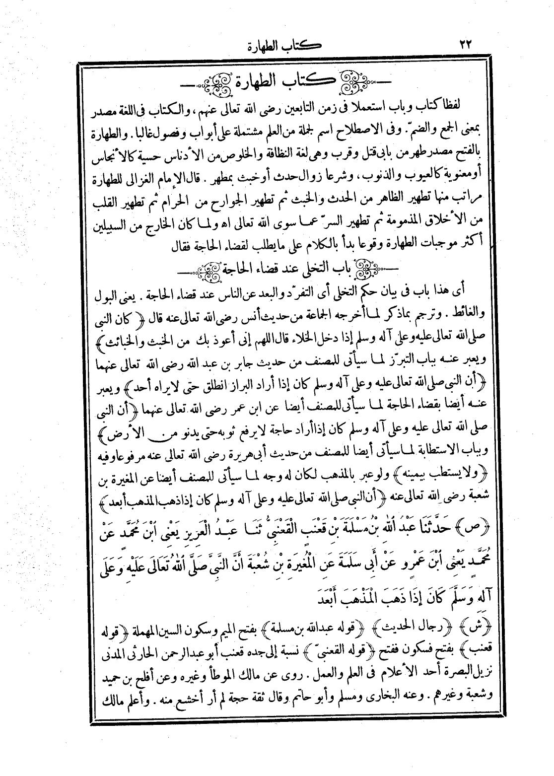 لفظا كتاب وباب استعملا في زمن التابعين رَضِيَ اللَّهُ تَعَالَى عَنْهُم، والكتاب في اللغة مصدر بمعنى الجمع والضمّ. وفى الاصطلاح اسم لجملة من العلم مشتملة علي أبواب وفصول غالبا. والطهارة بالفتح مصدر طهر من بابى قتل وقرب وهي لغة النظافة والخلوص من الأدناس حسية كالأنجاس أو معنوية كالعيوب والذنوب، وشرعا زوال حدث أو خبث بمطهر. قال الإمام الغزالى للطهارة مراتب منها تطهير الظاهر من الحدث والخبث ثم تطهير الجوارح من الحرام ثم تطهير القلب من الأخلاق المذمومة ثم تطهير السرّ عما سوى الله تعالى اه ولما كان الخارج من السبيلين أكثر موجبات الطهارة وقوعا بدأ بالكلام على ما يطلب لقضاء الحاجة فقال
