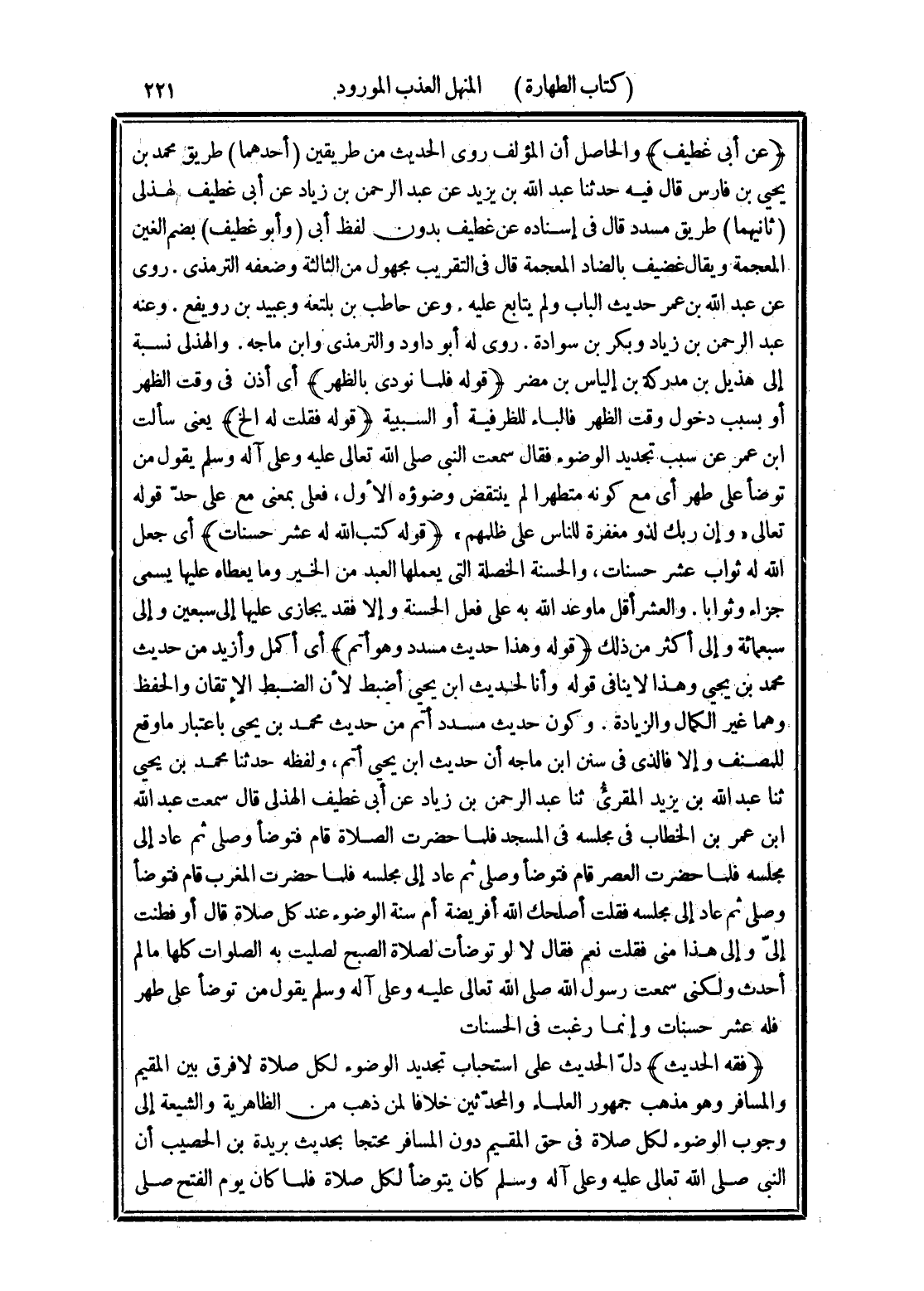 (قوله وهذا حديث مسدد وهو أتم) أى أكمل وأزيد من حديث محمد بن يحيى وهذا لا ينافي قوله وأنا لحديث ابن يحيى أضبط لأن الضبط الإتقان والحفظ وهما غير الكمال والزيادة. وكون حديث مسدد أتم من حديث محمد بن يحيى باعتبار ما وقع للمصنف وإلا فالذي في سنن ابن ماجه أن حديث ابن يحيى أتم، ولفظه حدثنا محمد بن يحيى ثنا عبد الله بن يزيد المقرئُ ثنا عبد الرحمن بن زياد عن أبي غطيف الهذلي قال سمعت عبد الله ابن عمر بن الخطاب في مجلسه في المسجد فلما حضرت الصلاة قام فتوضأ وصلى ثم عاد إلى مجلسه فلما حضرت العصر قام فتوضأ وصلى ثم عاد إلى مجلسه فلما حضرت المغرب قام فتوضأ وصلى ثم عاد إلى مجلسه قلت أصلحك الله أفريضة أم سنة الوضوء عند كل صلاة قال أو فطنت إليّ وإلى هذا مني فقلت نعم قال لا لو توضأت لصلاة الصبح لصليت به الصلوات كلها ما لم أحدث ولكني سمعت رسول الله صلى الله تعالى عليه وعلى آله وسلم يقول من توضأ على طهر فله عشر حسنات وإنما رغبت في الحسنات.