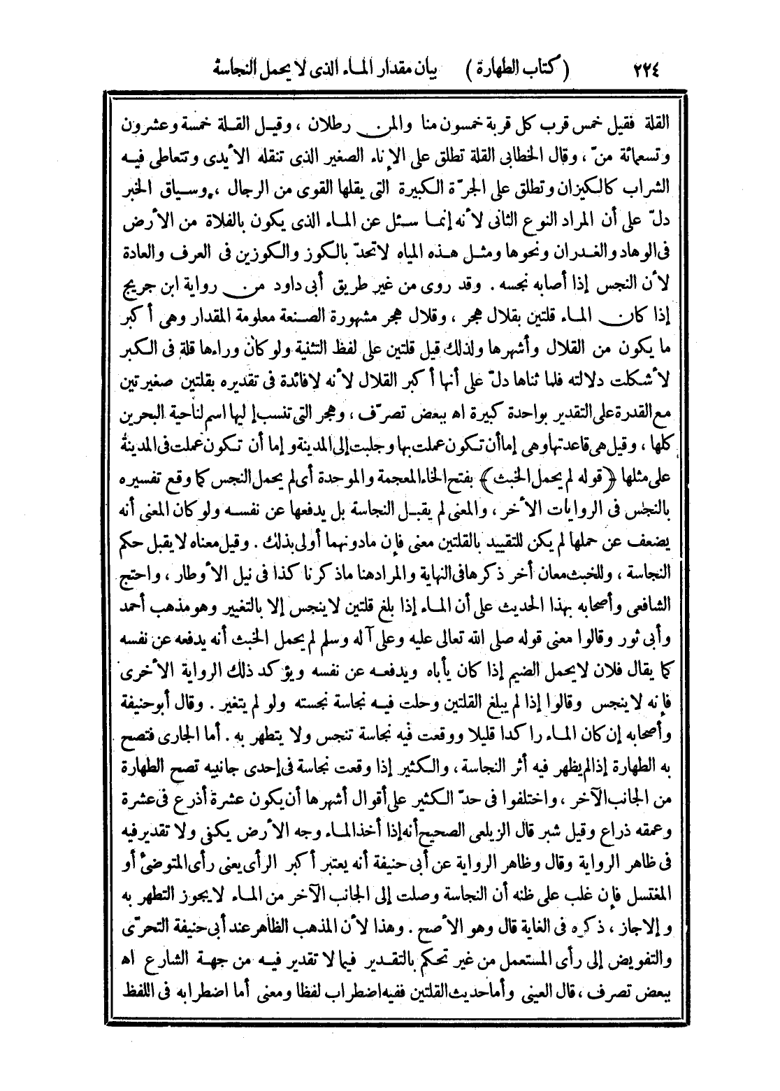 القلة فقيل خمس قرب كل قربة خمسون منا والمن رطلان، وقيل القلة خمسة وعشرون وتسعمائة منّ، وقال الخطابي القلة تطلق على الإناء الصغير الذي تنقله الأيدى وتتعاطى فيه الشراب كالكيزان وتطلق على الجرة الكبيرة التي يقلها القوى من الرجال، وسياق الخبر دلّ على أن المراد النوع الثاني لأنه إنما سئل عن الماء الذى يكون بالفلاة من الأرض في الوهاد والغدران ونحوها ومثل هذه المياه لا تحدّ بالكوز والكوزين في العرف والعادة لأن النجس إذا أصابه نجسه. وقد روى من غير طريق أبي داود من رواية ابن جريج إذا كان الماء قلتين بقلال هجر، وقلال هجر مشهورة الصنعة معلومة المقدار وهي أكبر ما يكون من القلال وأشهرها ولذلك قيل قلتين على لفظ التثنية ولو كان وراءها قلة في الكبر لأشكلت دلالته فلما ثناها دلّ على أنها أكبر القلال لأنه لا قائدة في تقديره بقلتين صغيرتين مع القدرة على التقدير بواحدة كبيرة اهـ ببعض تصرّف، وهجر التي تنسب إليها اسم لناحية البحرين كلها، وقيل هي قاعدتها وهي إما أن تكون عملت بها وجلبت إلى المدينة وإما أن تكون عملت في المدينة على مثلها