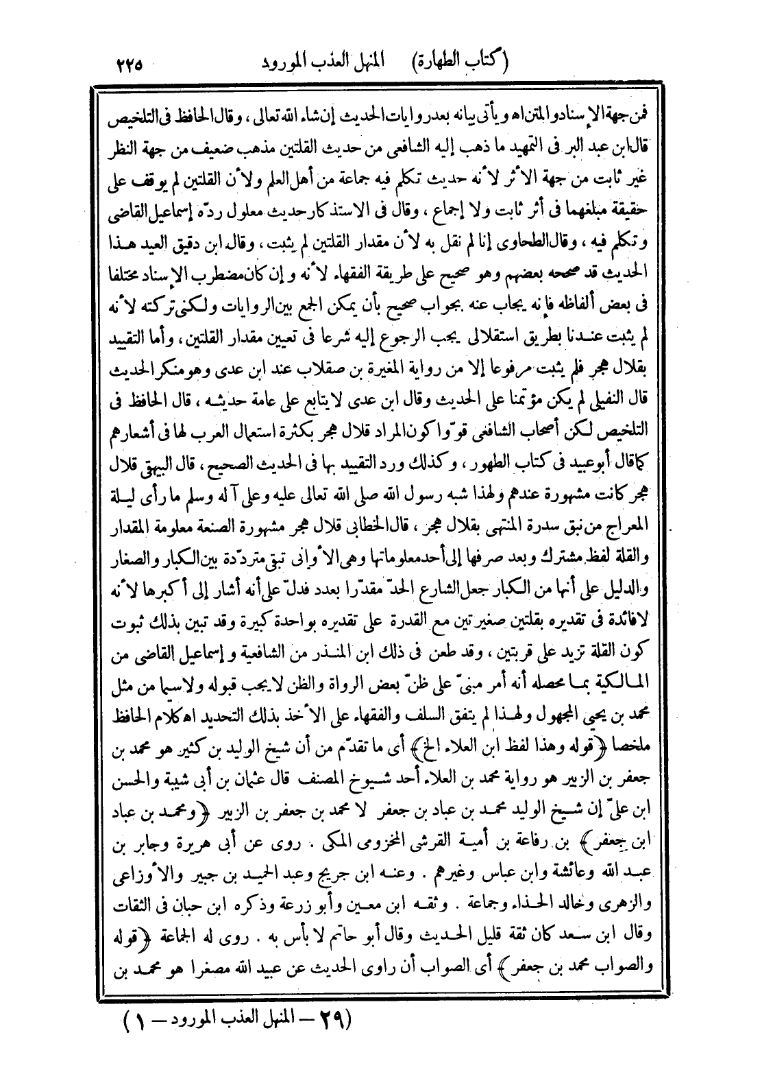 فمن جهة الإسناد والمتن اهـ ويأتي بيانه بعد روايات الحديث إن شاء الله تعالى، وقال الحافظ في التلخيص قال ابن عبد البر في التمهيد ما ذهب إليه الشافعى من حديث القلتين مذهب ضعيف من جهة النظر غير ثابت من جهة الأثر لأنه حديث تكلم فيه جماعة من أهل العلم ولأن القلتين لم يوقف على حقيقة مبلغهما في أثر ثابت ولا إجماع، وقال في الاستذكار حديث معلول ردّه إسماعيل القاضى وتكلم فيه، وقال الطحاوى إنا لم نقل به لأن مقدار القلتين لم يثبت، وقاله ابن دقيق العيد هذا الحديث قد صححه بعضهم وهو صحيح على طريقة الفقهاء لأنه وإن كان مضطرب الإسناد مختلفا في بعض ألفاظه فإنه يجاب عنه. بجواب صحيح بأن يمكن الجمع بين الروايات ولكني تركته لأنه لم يثيت عندنا بطريق استقلالي يجب الرجوع إليه شرعا في تعيين مقدار القلتين، وأما التقييد بقلال هجر فلم يثبت مرفوعا إلا من رواية المغيرة بن صقلاب عند ابن عدى وهو منكر الحديث قال النفيلي لم يكن مؤتمنا على الحديث وقال ابن عدى لا يتابع على عامة حديثه، قال الحافظ في التلخيص لكن أصحاب الشافعى قوّوا كون المراد قلال هجر بكثرة استعمال العرب لها في أشعارهم كما قال أبو عبيد في كتاب الطهور، وكذلك ورد التقييد بها في الحديث الصحيح، قال البيهقي قلال هجر كانت مشهورة عندهم ولهذا شبه رسول الله صلى الله تعالى عليه وعلى آله وسلم ما رأى ليلة المعراج من نبق سدرة المنتهى بقلال هجر، قال الخطابي قلال هجر مشهورة الصنعة معلومة المقدار والقلة لفظ، مشترك وبعد صرفها إلى أحد معلوماتها وهى الأواني تبقى متردّدة بين الكبار والصغار والدليل على أنها من الكبار جعل الشارع الحدّ مقدّرا بعدد فدلّ على أنه أشار إلى أكبرها لأنه لا فائدة في تقديره بقلتين صغيرين مع القدرة على تقديره بواحدة كبيرة وقد تبين بذلك ثبوت كون القلة تزيد على قربتين، وقد طعن في ذلك ابن المنذر من الشافعية وإسماعيل القاضى من المالكية بما محصله أنه أمر مبنيّ على ظنّ بعض الرواة والظن لا يجب قبوله ولا سيما من مثل محمد بن يحيى المجهول ولهذا لم يتفق السلف والفقهاء على الأخذ بذلك التحديد اهـ كلام الحافظ ملخصا
