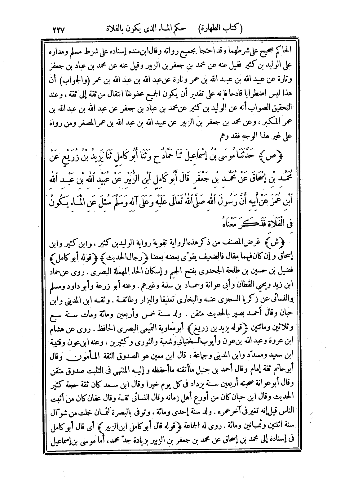 (ص) حَدَّثَنَا مُوسَى بْنُ إِسْمَاعِيلَ، ثَنَا حَمَّادٌ، ح وثَنَا أَبُو كَامِلٍ، ثَنَا يَزِيدُ ابْنَ زُرَيْعٍ، عَنْ مُحَمَّدِ بْنِ إِسْحَاقَ، عَنْ مُحَمَّدِ بْنِ جَعْفَرٍ، قَالَ أَبُو كَامِلٍ: ابْنُ الزُّبَيْرِ: عَنْ عُبَيْدِ اللَّهِ بْنِ عَبْدِ اللَّهِ بْنِ عُمَرَ، عَنْ أَبِيهِ، أَنَّ رَسُولَ اللَّهِ صَلَّى اللهُ تَعَالَى عَلَيْهِ وَعَلَى آلِهِ وسَلَّمَ سُئِلَ عَنِ الْمَاءِ يَكُونُ فِي الْفَلَاةِ فَذَكَرَ مَعْنَاهُ.