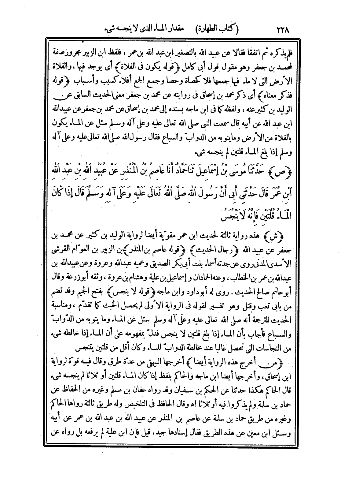 (ص) حَدَّثَنَا مُوسَى بْنُ إِسْمَاعِيلَ، ثَنَا حَمَّادٌ، أَنَا عَاصِمُ بْنُ الْمُنْذِرِ، عَنْ عُبَيْدِ اللَّهِ بْنِ عَبْدِ اللَّهِ بْنِ عُمَرَ، قَالَ: حَدَّثَنِي أَبِي، أَنَّ رَسُولَ اللَّهِ صَلَّى اللهُ تَعَالَى عَلَيْهِ وَعَلَى آلِهِ وسَلَّمَ قَالَ: «إِذَا كَانَ الْمَاءُ قُلَّتَيْنِ فَإِنَّهُ لَا يَنْجُسُ»