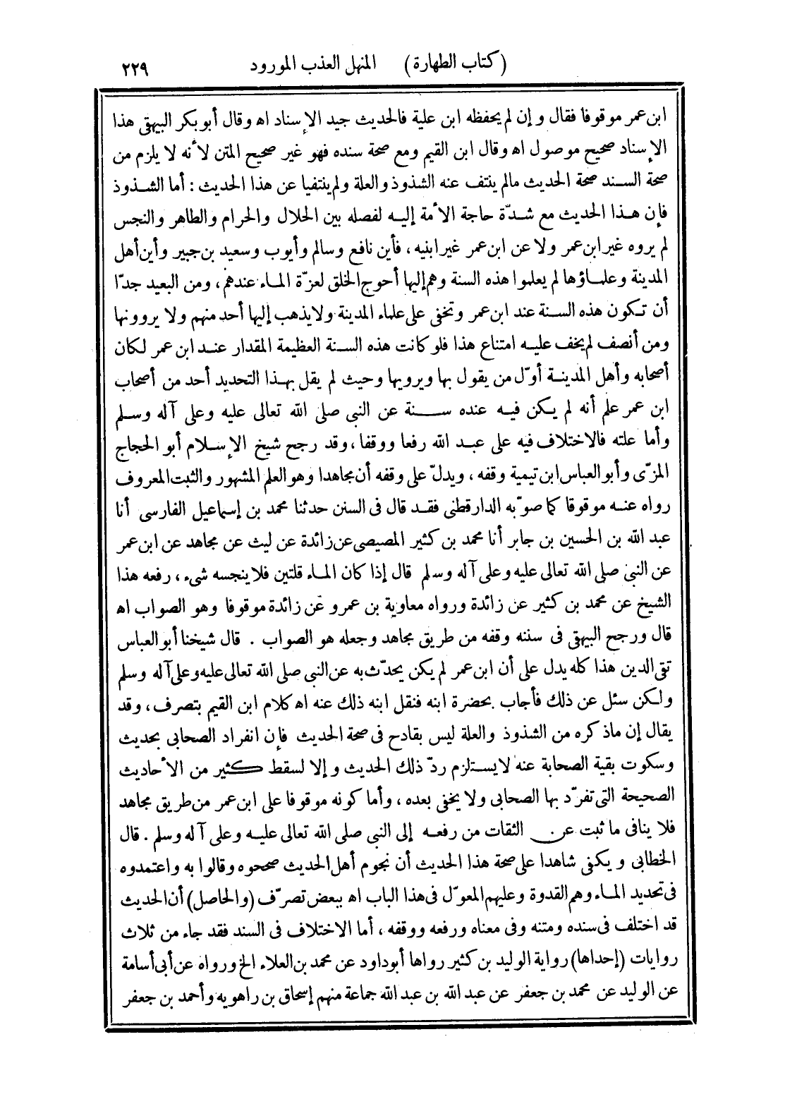 ابن عمر موقوفا فقال وإن لم يحفظه ابن علية فالحديث جيد الإسناد اهـ وقال أبو بكر البيهقي هذا الإسناد صحيح موصول اهـ وقال ابن القيم ومع صحة سنده فهو غير صحيح المتن لأنه لا يلزم من صحة السند صحة الحديث ما لم ينتف عنه الشذوذ والعلة ولم ينتفيا عن هذا الحديث: أما الشذوذ فإن هذا الحديث مع شدّة حاجة الأمة إليه لفصله بين الحلال والحرام والطاهر والنجس لم يروه غير ابن عمر ولا عن ابن عمر غير ابنيه، فأين نافع وسالم وأيوب وسعيد بن جبير وأين أهل المدينة وعلماوها لم يعلموا هذه السنة وهم إليها أحوج الخلق لعزّة الماء عندهم، ومن البعيد جدّا أن تكون هذه السنة عند ابن عمر وتخفى على علماء المدينة ولا يذهب إليها أحد منهم ولا يروونها ومن أنصف لم يخف عليه امتناع هذا فلو كانت هذه السنة العظيمة المقدار عند ابن عمر لكان أصحابه وأهل المدينة أوّل من يقول بها ويرويها وحيث لم يقل بهذا التحديد أحد من أصحاب ابن عمر علم أنه لم يكن فيه عنده سنة عن النبي صلى الله تعالى عليه وعلى آله وسلم وأما علته فالاختلاف فيه على عبد الله رفعا ووقفا، وقد رجح شيخ الإسلام أبو الحجاج المزّى وأبو العباس ابن تيمية وقفه، ويدلّ على وقفه أن مجاهدا وهو العلم المشهور والثبت المعروف رواه عنه موقوفا كما صوّبه الدارقطني فقد قال في السنن حدثنا محمد بن إسماعيل الفارسى أنا عبد الله بن الحسين بن جابر أنا محمد بن كثير المصيصى عن زائدة عن ليث عن مجاهد عن ابن عمر عن النبي صلى الله تعالى عليه وعلى آله وسلم قال إذا كان الماء قلتين فلا ينجسه شئ، رفعه هذا الشيخ عن محمد بن كثير عن زائدة ورواه معاوية بن عمرو عن زائدة موقوفا وهو الصواب اهـ قال ورجح البيهقي في سننه وقفه من طريق مجاهد وجعله هو الصواب. قال شيخنا أبو العباس تقي الدين هذا كله يدل على أن ابن عمر لم يكن يحدّث به عن النبي صلى الله تعالى عليه وعلى آله وسلم ولكن سئل عن ذلك فأجاب. بحضرة ابنه فنقل ابنه ذلك عنه اهـ كلام ابن القيم بتصرف، وقد يقال إن ما ذكره من الشذوذ والعلة ليس بقادح في صحة الحديث فإن انفراد الصحابي بحديث وسكوت بقية الصحابة عنه لا يستلزم ردّ ذلك الحديث وإلا لسقط كثير من الأحاديث الصحيحة التي تفرد بها الصحابي ولا يخفي بعده، وأما كونه موقوفا على ابن عمر من طريق مجاهد فلا ينافي ما ثبت عن الثقات من رفعه إلى النبى صلى الله تعالى عليه وعلى آله وسلم. قال الخطابي ويكفي شاهدا على صحة هذا الحديث أن نجوم أهل الحديث صححوه وقالوا به واعتمدوه في تحديد الماء وهم القدوة وعليهم المعوّل في هذا الباب اهـ ببعض تصرّف (والحاصل) أن الحديث قد اختلف في سنده ومتنه وفي معناه ورفعه ووقفه، أما الاختلاف في السند فقد جاء من ثلاث روايات (إحداها) رواية الوليد بن كثير رواها أبو داود عن محمد بن العلاء الخ ورواه عن أبي أسامة عن الوليد عن محمد بن جعفر عن عبد الله بن عبد الله جماعة منهم إسحاق بن راهوية وأحمد بن جعفر