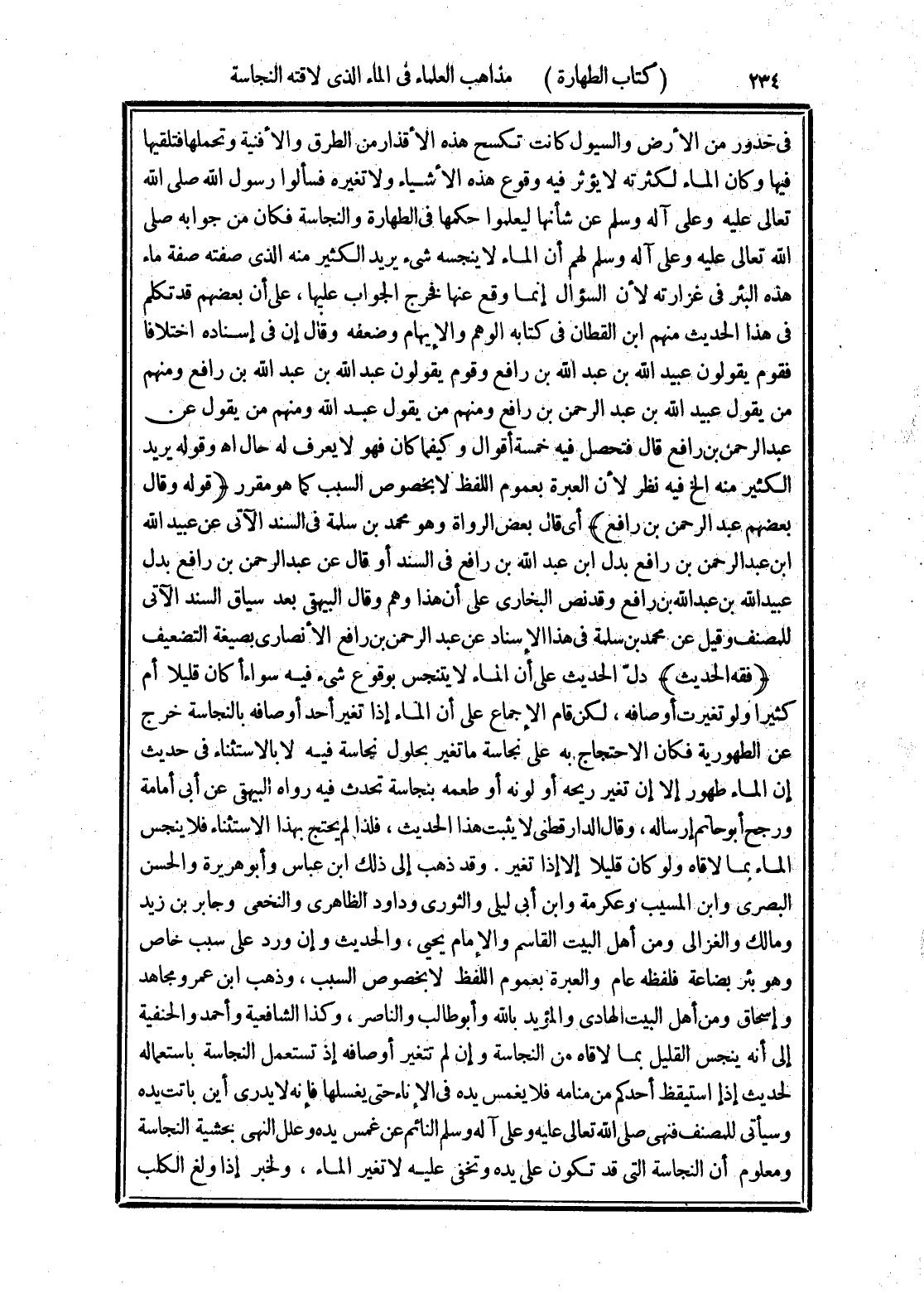 (فقه الحديث) دل الحديث على أن الماء لا يتنجس بوقوع شئ فيه سواء أكان قليلا أم كثيرا ولو تغيرت أوصافه، لكن قام الإجماع على أن الماء إذا تغير أحد أوصافه بالنجاسة خرج عن الطهورية فكان الاحتجاح به على نجاسة ما تغير بحلول نجاسة فيه لا بالاستثناء في حديث إن الماء طهور إلا إن تغير ريحه أو لونه أو طعمه بنجاسة تحدث فيه رواه البيهقي عن أبي أمامة ورجح أبو حاتم إرساله، وقال الدارقطني لا يثبت هذا الحديث، فلذا لم يحتج بهذا الاستثناء فلا ينجس الماء بما لاقاه ولو كان قليلا إلا إذا تغير. وقد ذهب إلى ذلك ابن عباس وأبو هريرة والحسن البصرى وابن المسيب. وعكرمة وابن أبي ليلى والثورى وداود الظاهرى والنخعى وجابر بن زيد ومالك والغزالى ومن أهل البيت القاسم والإمام يحيى، والحديث وإن ورد على سبب خاص وهو بئر بضاعة فلفظه عام والعبرة بعموم اللفظ لا بخصوص السبب، وذهب ابن عمر ومجاهد وإسحاق ومن أهل البيت الهادى والمؤيد بالله وأبو طالب والناصر، وكذا الشافعية وأحمد والحنفية إلى أنه ينجس القليل بما لاقاه من النجاسة وإن لم تتغير أوصافه إذ تستعمل النجاسة باستعماله لحديث إذا استيقظ أحدكم من منامه فلا يغمس يده في الإناء حتى يغسلها فإنه لا يدرى أين باتت يده وسيأتي للمصنف فنهى صلى الله تعالى عليه وعلى آله وسلم النائم عن غمس يده وعلل النهى بخشية النجاسة ومعلوم أن النجاسة التي قد تكون على يده وتخفي عليه لا تغير الماء، ولخبر إذا ولغ الكلب