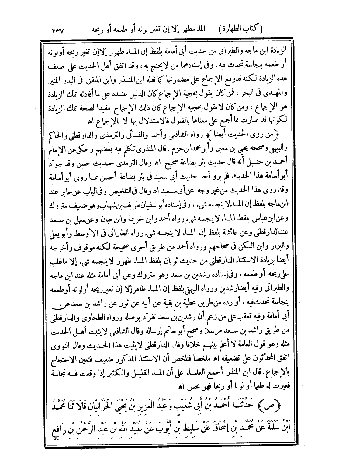الزيادة ابن ماجه والطبراني من حديث أبي أمامة بلفظ إن الماء طهور إلا إن تغير ريحه أو لونه أو طعمه بنجاسة تحدث فيه، وفي إسنادهما من لا يحتج به، وقد اتفق أهل الحديث على ضعف هذه الزيادة لكنه قد وقع الإجماع على مضمونها كما نقله ابن المنذر وابن الملقن في البدر المنير والمهدي في البحر، فمن كان يقول بحجية الإجماع كان الدليل عنده على ما أفادته تلك الزيادة هو الإجماع، ومن كان لا يقول بحجية الإجماع كان ذلك الإجماع مفيدا لصحة تلك الزيادة لكونها قد صارت مما أجمع على معناها بالقبول فالاستدلال بها لا بالإجماع اهـ.