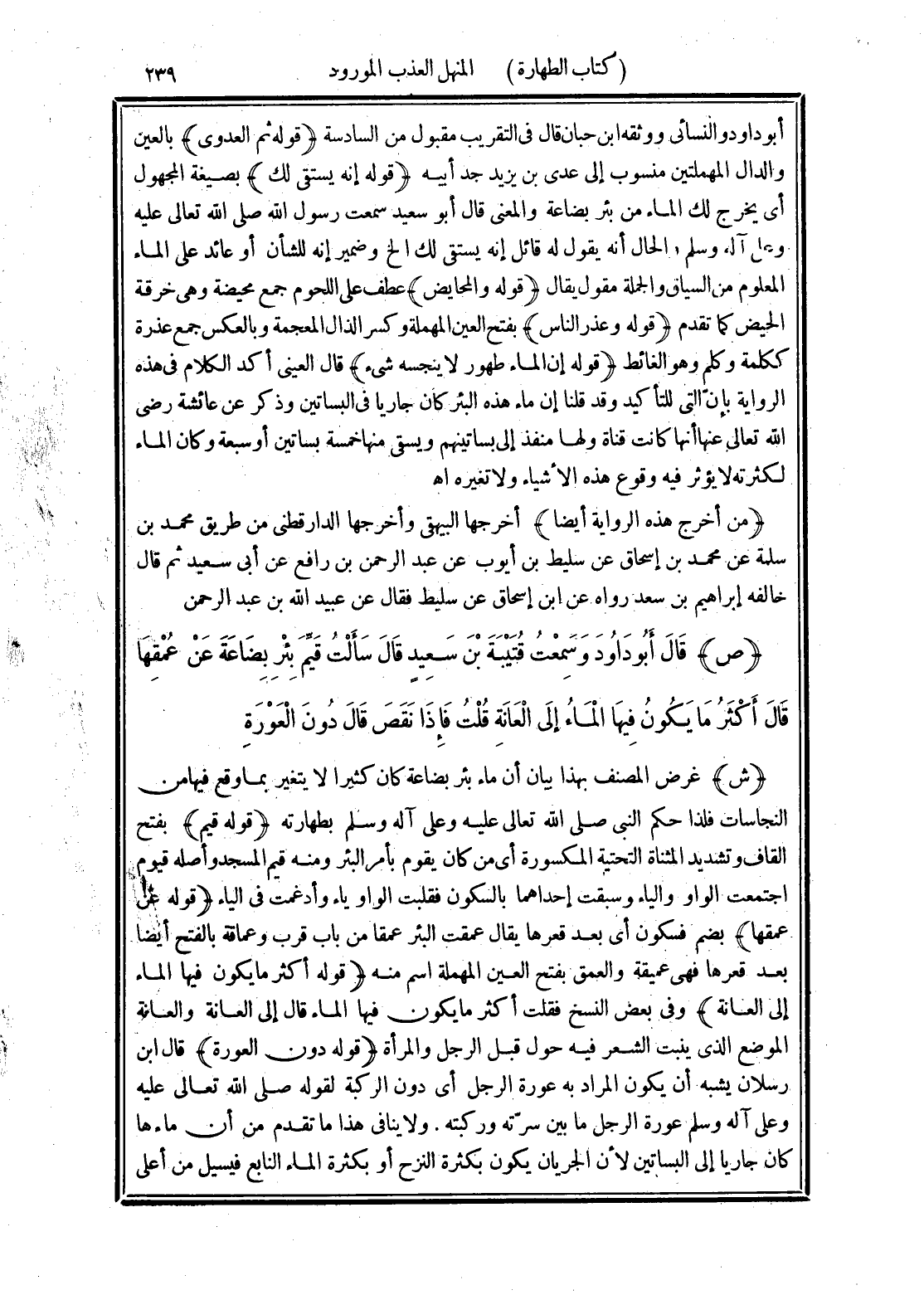 (ش) غرض المصنف بهذا بيان أن ماء بئر بضاعة كان كثيرا لا يتغير بما وقع فيها من النجاسات فلذا حكم النبي صلى الله تعالى عليه وعلى آله وسلم بطهارته
