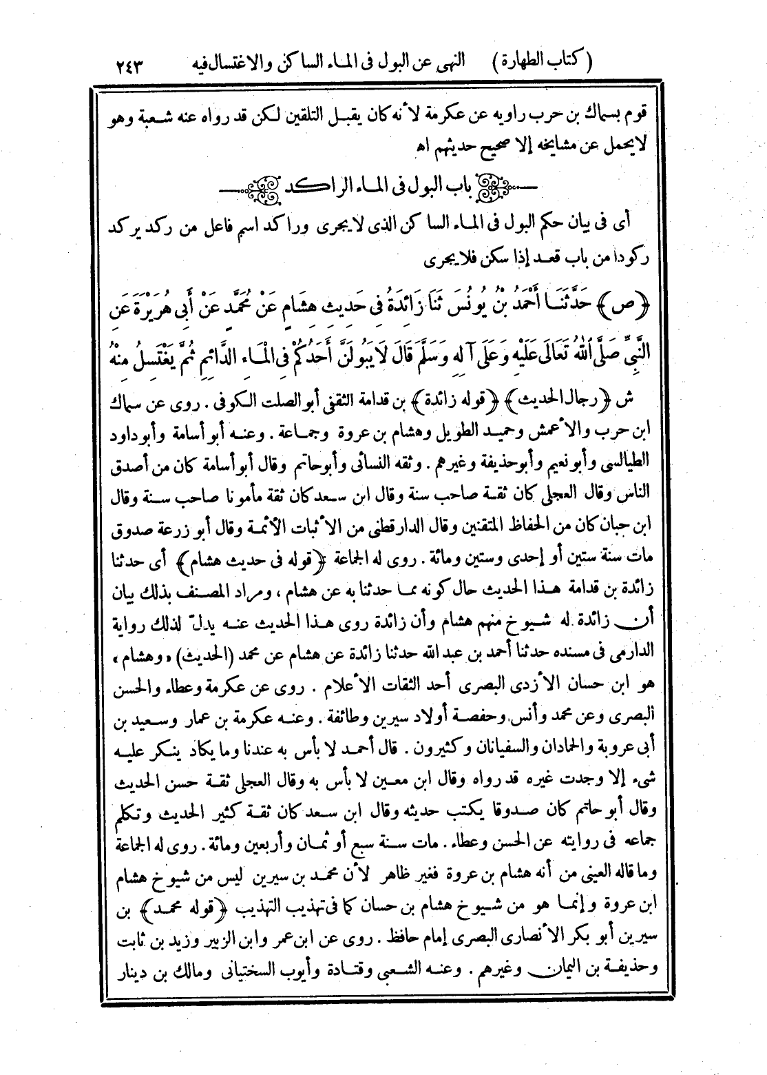 (ص) حَدَّثَنَا أَحْمَدُ بْنُ يُونُسَ، ثَنَا زَائِدَةُ، فِي حَدِيثِ هِشَامٍ، عَنْ مُحَمَّدٍ، عَنْ أَبِي هُرَيْرَةَ، عَنِ النَّبِيِّ صَلَّى اللهُ تَعَالَى عَلَيْهِ وَعَلَى آلِهِ وسَلَّمَ قَالَ: «لَا يَبُولَنَّ أَحَدُكُمْ فِي الْمَاءِ الدَّائِمِ ثُمَّ يَغْتَسِلُ مِنْهُ»