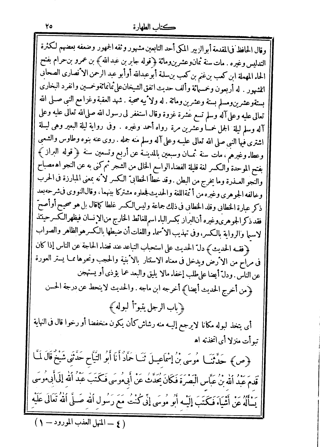 (قوله جابر بن عبد الله) بن عمرو بن حرام بفتح الحاء المهملة ابن كعب بن غنم بن كعب بن سلمة أبو عبد الله أو أبو عبد الرحمن الأنصارى الصحابي المشهور. له أربعون وخمسمائة وألف حديث اتفق الشيخان على ثمانمائة وخمسين وانفرد البخارى بستة وعشرين ومسلم بستة وعشرين ومائة. له ولأبيه صحبة. شهد العقبة وغزا مع النبى صلى الله تعالى عليه وعلى آله وسلم تسع عشرة غزوة وقال استيغفر لى رسول الله صلى الله تعالى عليه وعلى آله وسلم ليلة الجمل خمسا وعشرين مرة رواه أحمد وغيره. وفى رواية ليلة البعير وهي ليلة اشترى فيها النبى صلى الله تعالى عليه وعلى آله وسلم منه جمله. روى عنه بنوه وطاوس والشعبى وعطاء وغيرهم، مات سنة ثمان وسبعين بالمدينة عن أربع وتسعين سنة