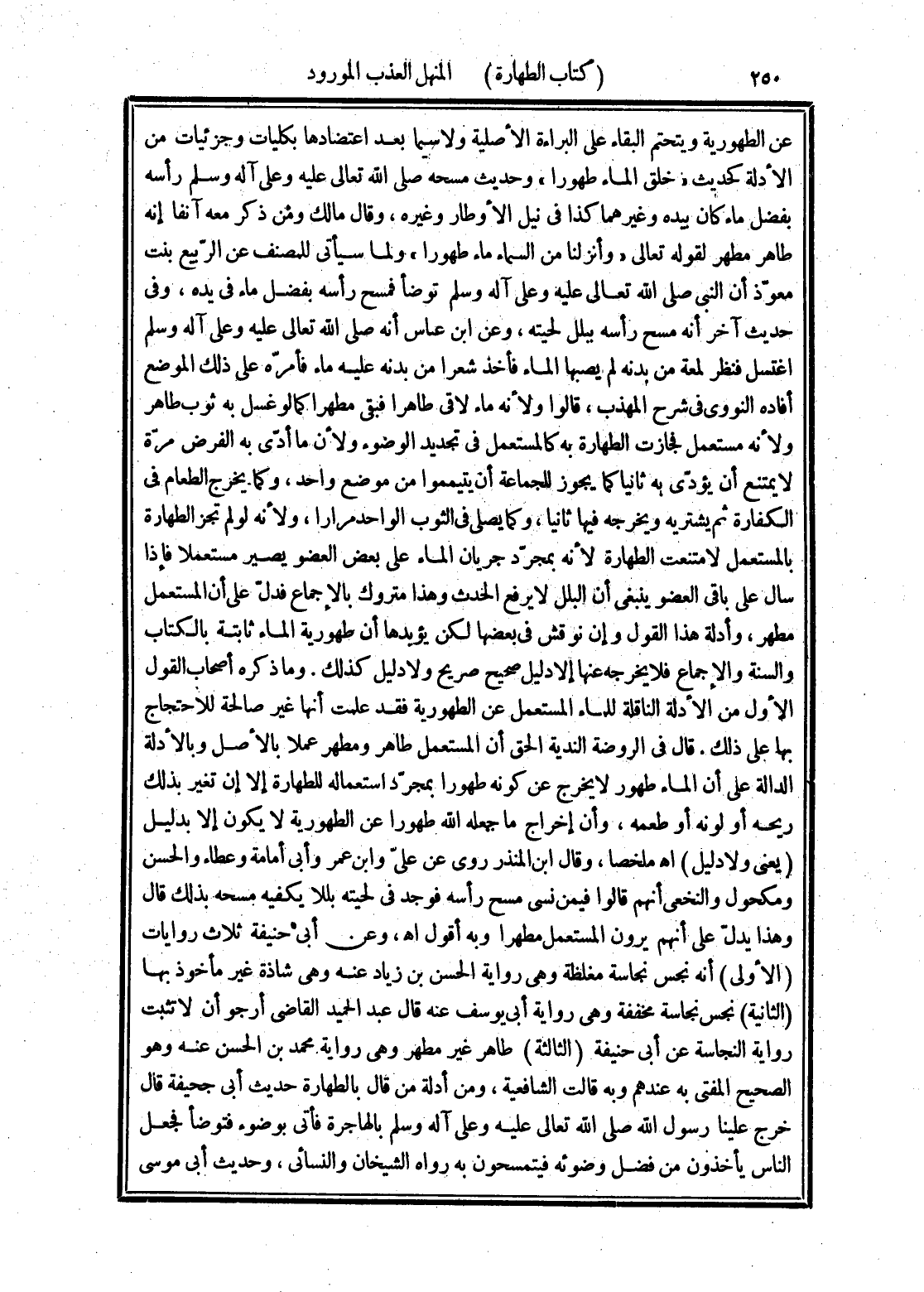 عن الطهورية ويتحتم البقاء على البراءة الأصلية ولا سيما بعد اعتضادها بكليات وجزئيات من الأدلة كحديث "خلق الماء طهورا" وحديث مسحه صلى الله تعالى عليه وعلى آله وسلم رأسه بفضل ماء كان بيده وغيرهما كذا في نيل الأوطار وغيره، وقال مالك ومن ذكر معه آنفا إنه طاهر مطهر لقوله تعالى "وأنزلنا من السماء ماء طهورا" ولما سيأتي للمصنف عن الرّبيع بنت معوّذ أن النبى صلى الله تعالى عليه وعلى آله وسلم توضأ فمسح رأسه بفضل ماء في يده، وفي حديث آخر أنه مسح رأسه ببلل لحيته، وعن ابن عباس أنه صلى الله تعالى عليه وعلى آله وسلم اغتسل فنظر لمعة من بدنه لم يصبها الماء فأخذ شعرا من بدنه عليه ماء فأمرّه على ذلك الموضع أفاده النووى في شرح المهذب، قالوا ولأنه ماء لاقى طاهرا فبقي مطهرا كما لو غسل به ثوب طاهر ولأنه مستعمل لجازت الطهارة به كالمستعمل في تجديد الوضوء ولأن ما أدّى به الفرض مرّة لا يمتنع أن يؤدّى به ثانيا كما يجوز للجماعة أن يتيمموا من موضع واحد، وكما يخرج الطعام في الكفارة ثم يشتريه ويخرجه فيها ثانيا، وكما يصلى في الثوب الواحد مرارا، ولأنه لو لم تجز الطهارة بالمستعمل لامتنعت الطهارة لأنه بمجرّد جريان الماء على بعض العضو يصير مستعملا فإذا سال على باقي العضو ينبغي أن البلل لا يرفع الحدث وهذا متروك بالإجماع فدلّ على أن المستعمل مطهر، وأدلة هذا القول وإن نوقش في بعضها لكن يؤيدها أن طهورية الماء ثابتة بالكتاب والسنة والإجماع فلا يخرجه عنها إلا دليل صحيح صريح ولا دليل كذلك. وما ذكره أصحاب القول الأول من الأدلة الناقلة للماء المستعمل عن الطهورية فقد علمت أنها غير صالحة للاحتجاج بها على ذلك. قال في الروضة الندية الحق أن المستعمل طاهر ومطهر عملا بالأصل وبالأدلة الدالة على أن الماء طهور لا يخرج عن كونه طهورا بمجرّد استعماله للطهارة إلا إن تغير بذلك ريحه أو لونه أو طعمه، وأن إخراج ما جعله الله طهورا عن الطهورية لا يكون إلا بدليل (يعني ولا دليل) اهـ ملخصا، وقال ابن المنذر روى عن علىّ وابن عمر وأبي أمامة وعطاء والحسن ومكحول والنخعى أنهم قالوا فيمن نسى مسح رأسه فوجد في لحيته بللا يكفيه مسحه بذلك قال وهذا يدل على أنهم يرون المستعمل مطهرا وبه أقول اهـ، وعن أبي حنيفة ثلاث روايات (الأولى) أنه نجس نجاسة مغلظه وهي رواية الحسن بن زياد عنه وهي شاذة غير مأخوذ بها (الثانية) نجس نجاسة مخففة وهي رواية أبي يوسف عنه قال عبد الحميد القاضى أرجو أن لا تثبت رواية النجاسة عن أبي حنيفة (الثالثة) طاهر غير مطهر وهي رواية محمد بن الحسن عنه وهو الصحيح المفتى به عندهم وبه قالت الشافعية، ومن أدلة من قال بالطهارة حديث أبي جحيفة قال خرج علينا رسول الله صلى الله تعالى عليه وعلى آله وسلم بالهاجرة فأتي بوضوء فتوضأ فجعل الناس يأخذون من فضل وضوئه فيتمسحون به رواه الشيخان والنسائي، وحديث أبي موسى
