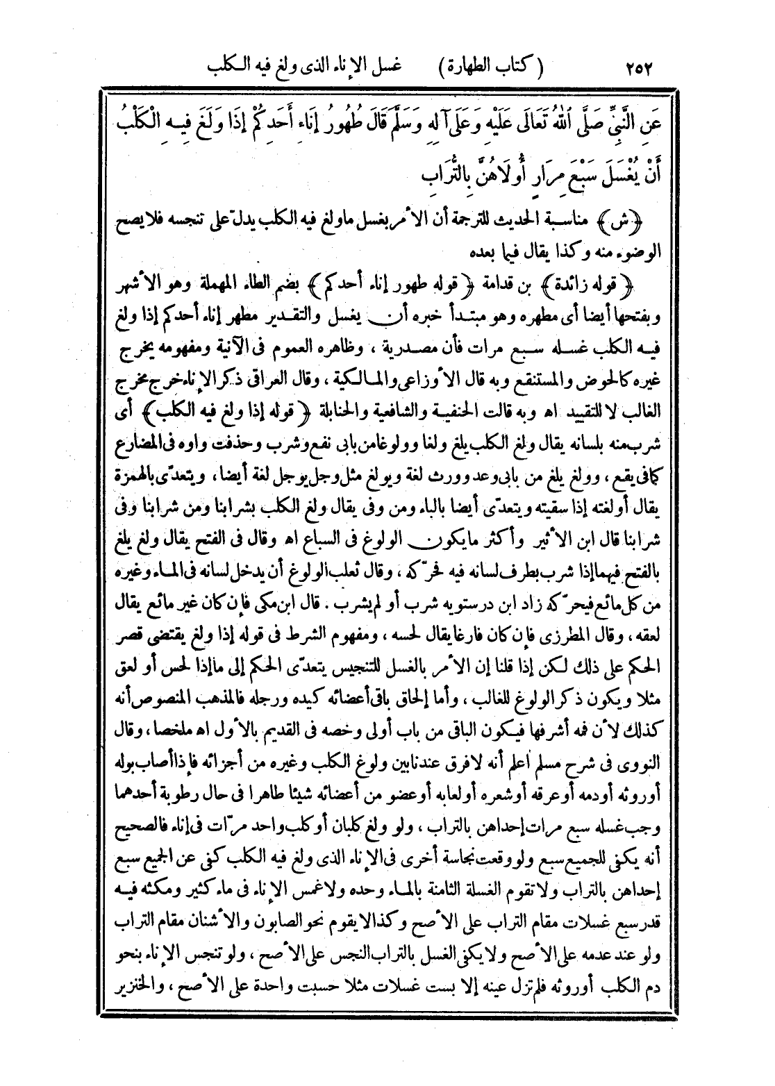 عَنِ النَّبِيِّ صَلَّى اللهُ تَعَالَى عَلَيْهِ وَعَلَى آلِهِ وسَلَّمَ قَالَ: «طُهُورُ إِنَاءِ أَحَدِكُمْ إِذَا وَلَغَ فِيهِ الْكَلْبُ، أَنْ يُغْسَلَ سَبْعَ مِرَارٍ، أُولَاهُنَّ بِتُرَابٍ»،