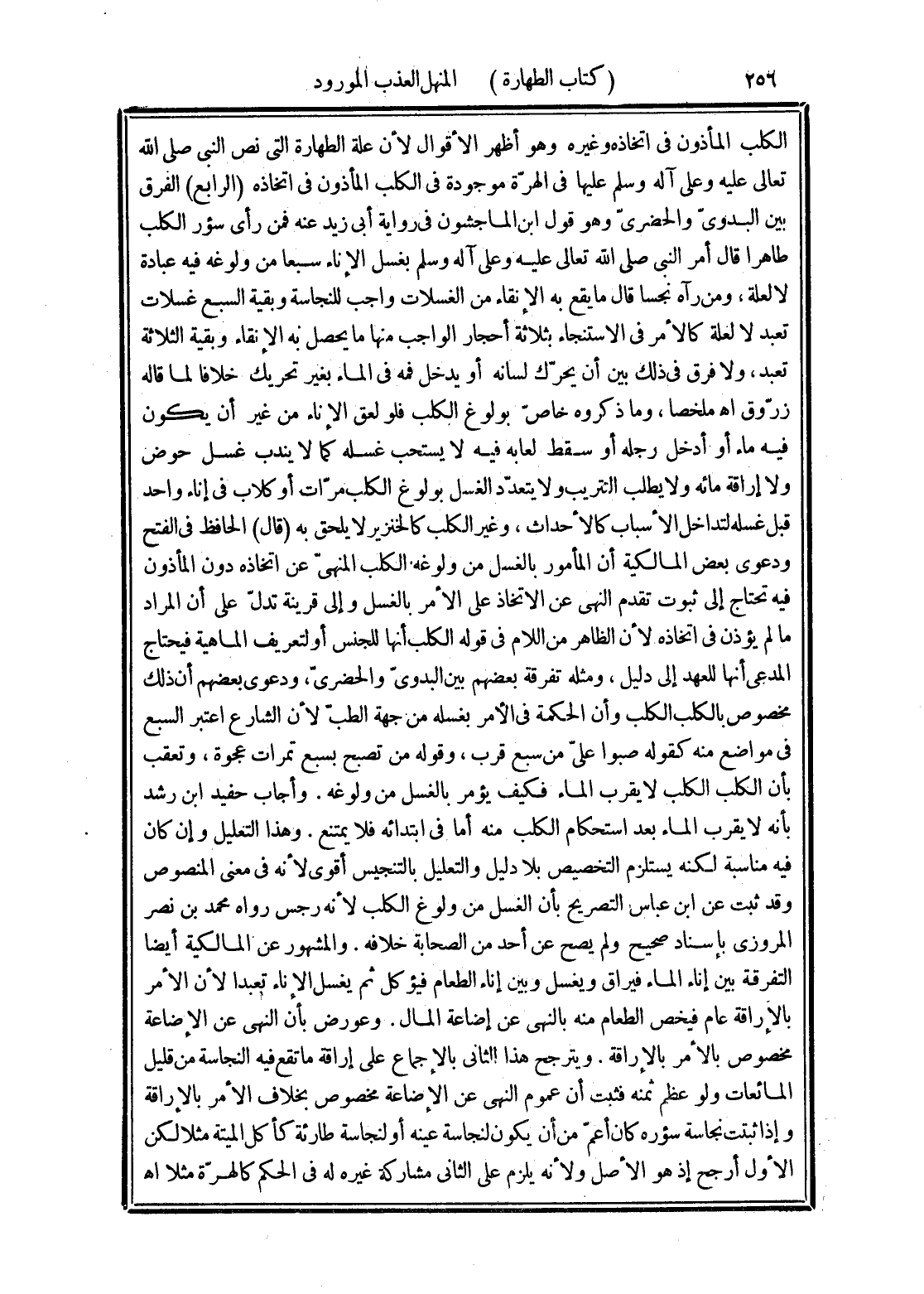 الكلب المأذون في اتخاذه وغيره وهو أظهر الأقوال لأن علة الطهارة التي نص النبى صلى الله تعالى عليه وعلى آله وسلم عليها في الهرّة موجودة في الكلب المأذون في اتحاذه (الرابع) الفرق بين البدوىّ والحضرىّ وهو قول ابن الماجشون في رواية أبي زيد عنه فمن رأى سؤر الكلب طاهرا قال أمر النبي صلى الله تعالى عليه وعلى آله وسلم بغسل الإناء سبعا من ولوغه فيه عبادة لا لعلة، ومن رآه نجسا قال ما يقع به الإنقاء من الغسلات واجب للنجاسة وبقية السبع غسلات تعبد لا لعلة كالأمر في الاستنجاء ثلاثة أحجار الواجب منها ما يحصل به الإنقاء وبقية الثلاثة تعبد، ولا فرق في ذلك بين أن يحرّك لسانه أو يدخل فمه في الماء بغير تحريك خلافا لما قاله زرّوق اهـ ملخصا، وما ذكروه خاصّ بولوغ الكلب فلو لعق الإناء من غير أن يكون فيه ماء أو أدخل رجله أو سقط لعابه فيه لا يستحب غسله كما لا يندب غسل حوض ولا إراقة مائه ولا يطلب التتريب ولا يتعدّد الغسل بولوغ الكلب مرّات أو كلاب في إناء واحد قبل غسله لتداخل الأسباب كالأحداث، وغير الكلب كالخنزير لا يلحق به (قال) الحافظ في الفتح ودعوى بعض المالكية أن المأمور بالغسل من ولوغه الكلب المنهى عن اتخاذه دون المأذون فيه تحتاج إلى ثبوت تقدم النهى عن الاتخاذ على الأمر بالغسل وإلى قرينة تدلّ على أن المراد ما لم يؤذن في اتخاذه لأن الظاهر من اللام في قوله الكلب أنها للجنس أو لتعريف الماهية فيحتاج المدعي أنها للعهد إلى دليل، ومثله تفرقة بعضهم بين البدوىّ والحضرىّ، ودعوى بعضهم أن ذلك مخصوص بالكلب الكلب وأن الحكمة في الأمر بغسله من جهة الطبّ لأن الشارع اعتبر السبع في مواضع منه كقوله صبوا علىّ من سبع قرب، وقوله من تصبح بسبع تمرات عجوة، وتعقب بأن الكلب الكلب لا يقرب الماء فكيف يؤمر بالغسل من ولوغه. وأجاب حفيد ابن رشد بأنه لا يقرب الماء بعد استحكام الكلب منه أما في ابتدائه فلا يمتنع. وهذا التعليل وإن كان فيه مناسبة لكنه يستلزم التخصيص بلا دليل والتعليل بالتنجيس أقوى لأنه في معنى المنصوص وقد ثبت عن ابن عباس التصريح بأن الغسل من ولوغ الكلب لأنه رجس رواه محمد بن نصر المروزى بإسناد صحيح ولم يصح عن أحد من الصحابة خلافه. والمشهور عن المالكية أيضا التفرقة بين إناء الماء فيراق ويغسل وبين إناء الطعام فيؤكل ثم يغسل الإناء تعبدا لأن الأمر بالإراقة عام فيخص الطعام منه بالنهى عن إضاعة المال. وعورض بأن النهى عن الإضاعة مخصوص بالأمر بالإراقة. ويترجح هذا الثاني بالإجماع على إراقة ما تقع فيه النجاسة من قليل المائعات ولو عظم ثمنه فثبت أن عموم النهى عن الإضاعة مخصوص بخلاف الأمر بالإراقة وإذا ثبتت نجاسة سؤره كان أعمّ من أن يكون لنجاسة عينه أو لنجاسة طارئة كأكل الميتة مثلا لكن الأول أرجح إذ هو الأصل ولأنه يلزم على الثاني مشاركة غيره له في الحكم كالهرّة مثلا اهـ