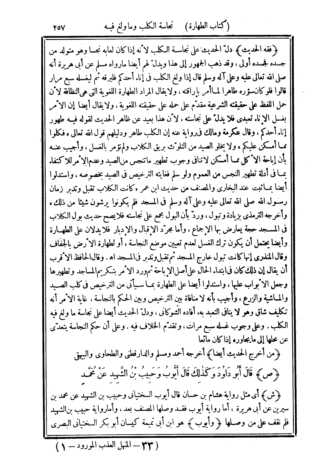 (فقه الحديث) دلّ الحديث على نجاسة الكلب لأنه إذا كان لعابه نجسا وهو متولد من جسده فجسده أولى، وقد ذهب الجمهور إلى هذا ويدلّ لهم أيضا ما رواه مسلم عن أبي هريرة أنه صلى الله تعالى عليه وعلى آله وسلم قال إذا ولغ الكلب في إناء أحدكم فليرقه ثم ليغسله سبع مرار قالوا فلو كان سؤره طاهرا لما أمر بإراقته، ولا يقال المراد الطهارة اللغوية التي هي النظافة لأن حمل اللفظ على حقيقته الشرعية مقدّم على حمله على حقيقته اللغوية، ولا يقال أيضا إن الأمر بغسل الإناء تعبدى فلا يدلّ على نجاسته، لأن هذا بعيد عن ظاهر الحديث لقوله فيه طهور إناء أحدكم، وقال عكرمة ومالك في رواية عنه إن الكلب طاهر ودليلهم قول الله تعالى "فكلوا مما أمسكن عليكم" ولا يخلو الصيد من التلوّث بريق الكلاب ولم نؤمر بالغسل، وأجيب عنه بأن إباحة الأكل مما أمسكن لا تنافي وجوب تطهير ما تنجس من الصيد وعدم الأمر للاكتفاء بما في أدلة تطهير النجس من العموم ولو سلم فغايته الترخيص في الصيد بخصوصه، واستدلوا أيضا بما ثبت عند البخارى والمصنف من حديث ابن عمر "كانت الكلاب تقبل وتدبر زمان رسول الله صلى الله تعالى عليه وعلى آله وسلم في المسجد فلم يكونوا يرشون شيئا من ذلك" وأخرجه الترمذي بزيادة وتبول، وردّ بأن البول مجمع على نجاسته فلا يصح حديث بول الكلاب في المسجد حجة يعارض بها الإجماع، وأما مجرّد الإقبال والإدبار فلا يدلان على الطهارة وأيضا يحتمل أن يكون ترك الغسل لعدم تعيين موضع النجاسة، أو لطهارة الأرض بالجفاف وقال المنذرى إنها كانت تبول خارج المسجد ثم تقبل وتدبر في المسجد اهـ. وقال الحافظ الأقرب أن يقال إن ذلك كان في ابتداء الحال على أصل الإباحة ثم ورد الأمر بتكريم المساجد وتطهيرها وجعل الأبواب عليها، واستدلوا أيضا على الطهارة بما سيأتي من الترخيص في كلب الصيد والماشية والزرع، وأجيب بأنه لا منافاة بين الترخيص وبين الحكم بالنجاسة، غاية الأمر أنه تكليف شاق وهو لا ينافي التعبد به، أفاده الشوكاني، ودلّ الحديث أيضا على نجاسة ما ولغ فيه الكلب. وعلى وجوب غسله سبع مرات، وتقدّم الخلاف فيه. وعلى أن حكم النجاسة يتعدّى عن محلها إلى ما يجاوره إذا كان مائعا.