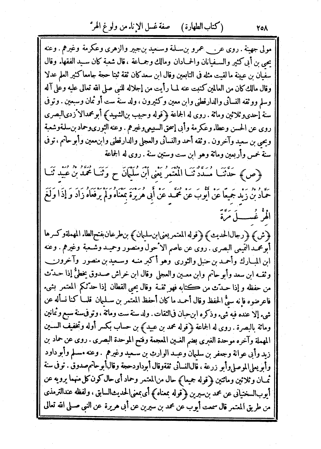 (ص) حَدَّثَنَا مُسَدَّدٌ، ثَنَا الْمُعْتَمِرُ يَعْنِي ابْنَ سُلَيْمَانَ، ح ثَنَا مُحَمَّدُ بْنُ عُبَيْدٍ، ثَنَا حَمَّادُ بْنُ زَيْدٍ، جَمِيعًا عَنْ أَيُّوبَ، عَنْ مُحَمَّدٍ، عَنْ أَبِي هُرَيْرَةَ بِمَعْنَاهُ، وَلَمْ يَرْفَعَاهُ زَادَ: «وَإِذَا وَلَغَ الْهِرُّ غُسِلَ مَرَّة»