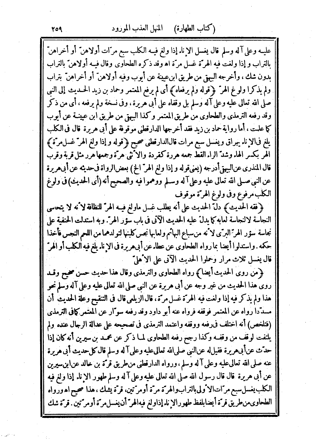 (من روى الحديث أيضا) رواه الطحاوى والترمذى وقال هذا حديث حسن صحيح وقد روى هذا الحديث من غير وجه عن أبي هريرة عن النبى صلى الله تعالى عليه وعلى آله وسلم نحو هذا ولم يذكر فيه إذا ولغت فيه الهرّة غسل مرّة، قال الزيلعى قال في التنقيح وعلة الحديث أن مسدّدا رواه عن المعتمر فوقفه فرواه عنه أبو داود وقد رفعه سوّار عن المعتمر كما في الترمذى (فتلخص) أنه اختلف في رفعه ووقفه واعتمد التزمذى في تصحيحه على عدالة الرجال عنده ولم يلتفت لوقف من وفقه وكذا رجح رفعه الطحاوى لما ذكر عن محمد بن سيرين أنه كان إذا حدّث عن أبي هريرة فقيل له عن النبي صلى الله تعالى عليه وعلى آله وسلم قال كل حديث أبي هريرة عنه صلى الله تعالى عليه وعلى آله وسلم، ورواه الدارقطني من طريق قرّة بن خالد عن ابن سيرين عن أبي هريرة قال قال رسول الله صلى الله تعالى عليه وعلى آله وسلم طهور الإناء إذا ولغ فيه الكلب يغسل سبع مرّات الأولى بالتراب والهرة مرّة أو مرّتين، قرّة يشك، هذا صحيح اهـ ورواه الطحاوى من طريق قرّة أيضا بلفظ طهور الإناء إذا ولغ فيه الهرّ أن يغسل مرّة أو مرّتين. قرّة شك