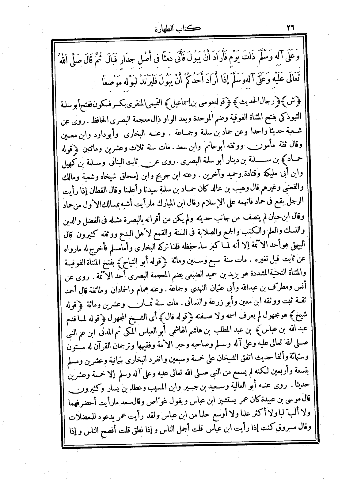 (قوله حماد) بن سلمة بن دينار أبو سلمة البصرى. روى عن ثابت البنانى وسلمة بن كهيل وابن أبى مليكة وقتادة وحميد وآخرين. وعنه ابن جريج وابن إسحاق شيخاه وشعبة ومالك والقعنبى وغيرهم قال وهيب بن خالد كان حماد بن سلمة سيدنا وأعلمنا وقال القطان إذا رأيت الرجل يقع في حماد فاتهمه على الإسلام وقال ابن المبارك ما رأيت أشبه بمسالك الأول من حماد وقال ابن حبان لم ينصف من جانب حديثه ولم يكن من أقرانه بالبصرة مثله في الفضل والدين والنسك والعلم والكتب والجمع والصلابة في السنة والقمع لأهل البدع ووثقه كثيرون قال البيهقى هو أحد الأئمة إلا أنه لما كبر ساء حفظه فلذا تركه البخارى وأما مسلم فأخرج له ما رواه عن ثابت قبل تغيره. مات سنة سبع وستين ومائة