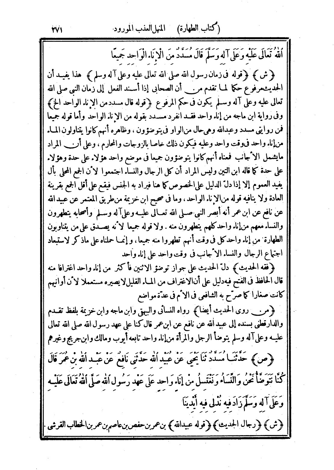 (ص) حَدَّثَنَا مُسَدَّدٌ، ثَنَا يَحْيَى، عَنْ عُبَيْدِ اللَّهِ، حَدَّثَنِي نَافِعٌ، عَنْ عَبْدِ اللَّهِ بْنِ عُمَرَ، قَالَ: «كُنَّا نَتَوَضَّأُ نَحْنُ وَالنِّسَاءُ ونغتسل من إناءٍ واحدٍ عَلَى عَهْدِ رَسُولِ اللَّهِ صَلَّى اللهُ تَعَالَى عَلَيْهِ وَعَلَى آلِهِ وَسَلَّمَ، زاد فيه: نُدْلِي فِيهِ أَيْدِيَنَا»