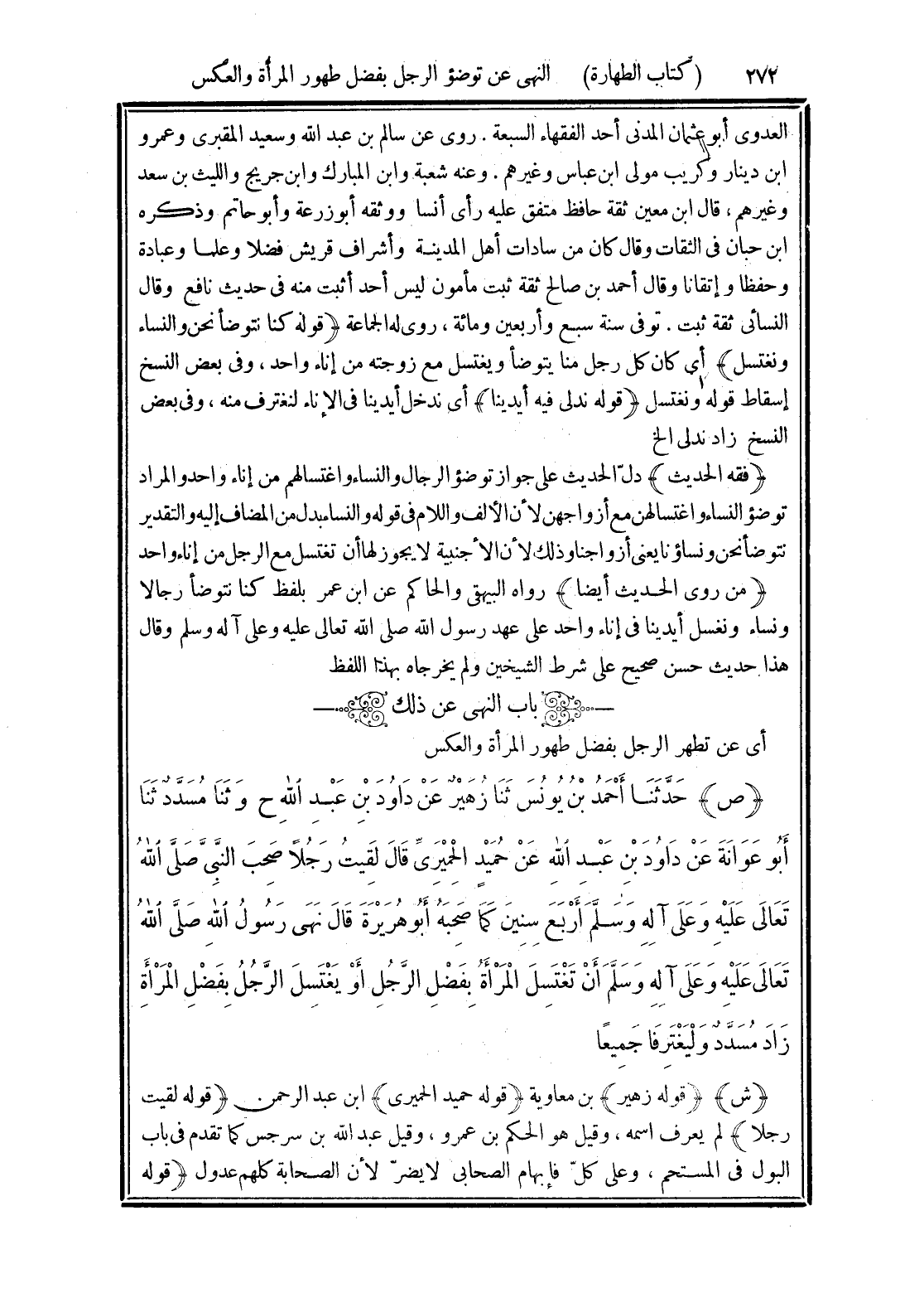 (ص) حَدَّثَنَا أَحْمَدُ بْنُ يُونُسَ، ثَنَا زُهَيْرٌ، عَنْ دَاوُدَ بْنِ عَبْدِ اللَّهِ، ح وَثَنَا مُسَدَّدٌ، ثَنَا أَبُو عَوَانَةَ، عَنْ دَاوُدَ بْنِ عَبْدِ اللَّهِ، عَنْ حُمَيْدٍ الْحِمْيَرِيِّ، قَالَ: لَقِيتُ رَجُلًا صَحِبَ النَّبِيَّ صَلَّى اللهُ تَعَالَى عَلَيْهِ وَعَلَى آلِهِ وَسَلَّمَ أَرْبَعَ سِنِينَ، كَمَا صَحِبَهُ أَبُو هُرَيْرَةَ، قَالَ: «نَهَى رَسُولُ اللَّهِ صَلَّى اللهُ تَعَالَى عَلَيْهِ وَعَلَى آلِهِ وَسَلَّمَ أَنْ تَغْتَسِلَ الْمَرْأَةُ بِفَضْلِ الرَّجُلِ، أَوْ يَغْتَسِلَ الرَّجُلُ بِفَضْلِ الْمَرْأَةِ»، زَادَ مُسَدَّدٌ: «وَلْيَغْتَرِفَا جَمِيعًا»