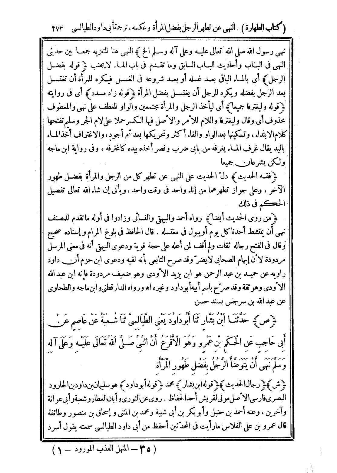 (ص) حَدَّثَنَا ابْنُ بَشَّارٍ، ثَنَا أَبُو دَاوُدَ يَعْنِي الطَّيَالِسِيَّ، ثَنَا شُعْبَةُ، عَنْ عَاصِمٍ، عَنْ أَبِي حَاجِبٍ، عَنِ الْحَكَمِ بْنِ عَمْرٍو وَهُوَ الْأَقْرَعُ، «أَنَّ النَّبِيَّ صَلَّى اللهُ تَعَالَى عَلَيْهِ وَعَلَى آلِهِ وَسَلَّمَ نَهَى أَنْ يَتَوَضَّأَ الرَّجُلُ بِفَضْلِ طَهُورِ الْمَرْأَةِ»