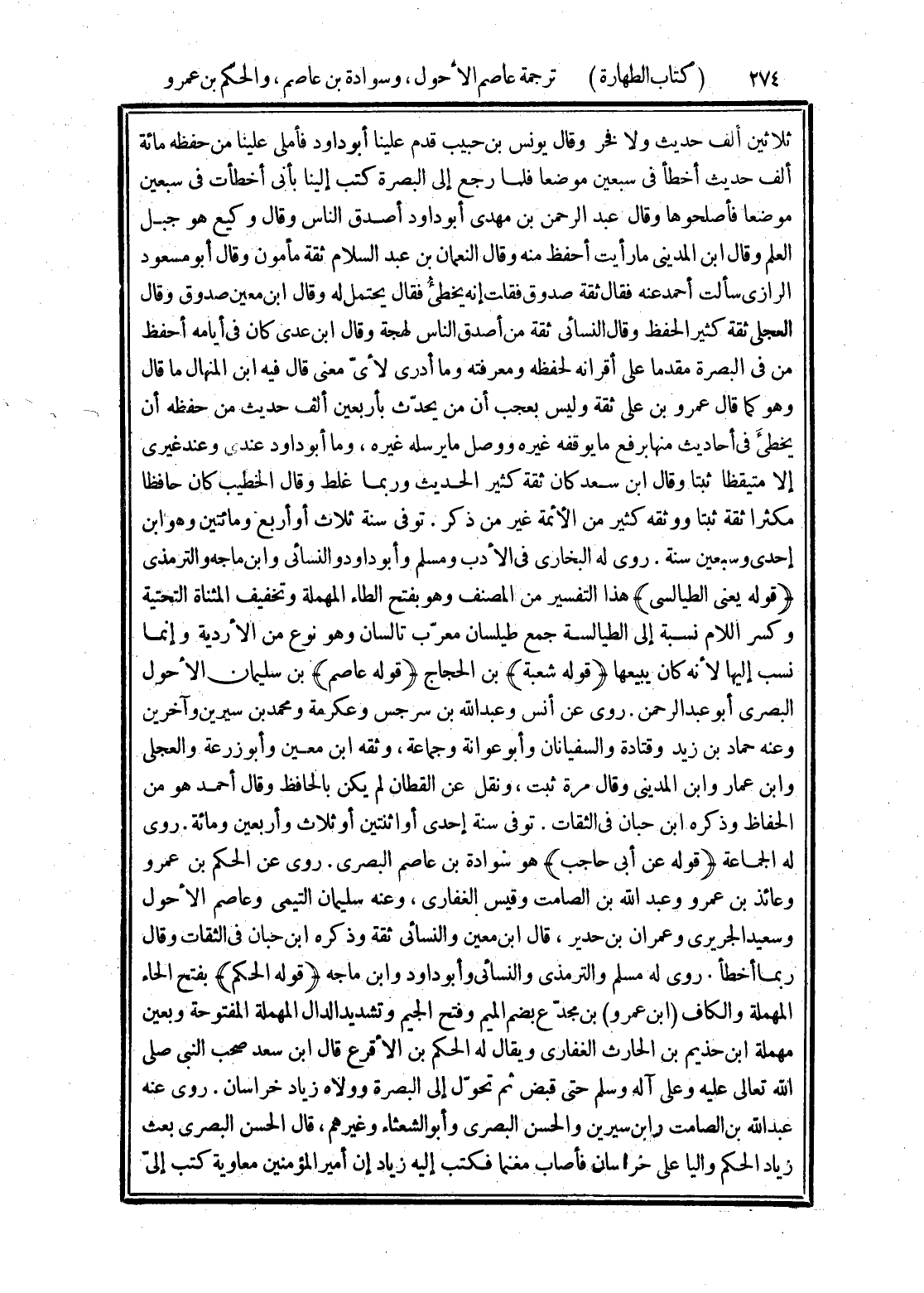 (قوله عاصم) بن سليمان الأحول البصرى أبو عبد الرحمن. روى عن أنس وعبد الله بن سرجس وعكرمة ومحمد بن سيرين وآخرين وعنه حماد بن زيد وقتادة والسفيانان وأبو عوانة وجماعة، وثقه ابن معين وأبو زرعة والعجلى وابن عمار وابن المديني وقال مرة ثبت، ونقل عن القطان لم يكن بالحافظ وقال أحمد هو من الحفاظ وذكره ابن حبان في الثقات. توفي سنة إحدى أو اثنتين أو ثلاث وأربعين ومائة. روى له الجماعة