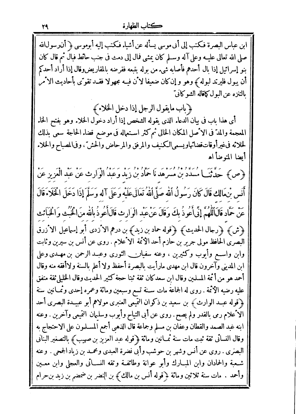 (ص) حَدَّثَنَا مُسَدَّدُ بْنُ مُسَرْهَدٍ، نَا حَمَّادُ بْنُ زَيْدٍ، وَعَبْدُ الْوَارِثِ، عَنْ عَبْدِ الْعَزِيزِ عَنْ أَنَسِ بْنِ مَالِكٍ، قَالَ: كَانَ رَسُولُ اللَّهِ صَلَّى اللهُ تعالى عَلَيْهِ وعلى آله وَسَلَّمَ إِذَا دَخَلَ الْخَلَاءَ قَالَ: عَنْ حَمَّادٍ قَالَ: «اللَّهُمَّ إِنِّي أَعُوذُ بِكَ» وَقَالَ: عَنْ عَبْدِ الْوَارِثِ قَالَ: «أَعُوذُ بِاللَّهِ مِنَ الْخُبُثِ وَالْخَبَائِثِ»