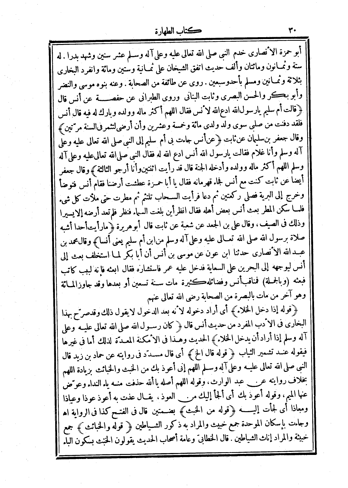 أبو حمزة الأنصارى خدم النبى صلى الله تعالى عليه وعلى آله وسلم عشر سنين وشهد بدرا. له ستة وثمانون ومائتان وألف حديث اتفق الشيخان على ثمانية وستين ومائة وانفرد البخارى بثلاثة وثمانين ومسلم بأحد وسبعين. روى عن طائفة من الصحابة. وعنه بنوه موسى والنضر وأبو بكر والحسن البصرى وثابت البنانى وروى الطبرانى عن حفصة عن أنس قال (قالت أم سليم يا رسول الله ادع الله لأنس فقال اللهم أكثر ماله وولده وبارك له فيه قال أنس فلقد دفنت من صلبى سوى ولد ولدى مائة وخمسة وعشرين وأن أرضي لتثمر في السنة مرّتين) وقال جعفر بن سليمان عن ثابت (عن أنس جاءت بى أم سليم إلى النبى صلى الله تعالى عليه وعلى آله وسلم وأنا غلام فقالت يا رسول الله أنس ادع الله له فقال النبى صلى الله تعالى عليه وعلى آله وسلم اللهم أكثر ماله وولده وأدخله الجنة قال قد رأيت اثنتين وأنا أرجو الثالثة) وقال جعفر أيضا عن ثابت كنت مع أنس فجاء قهرمانه فقال يا أبا حمزة عطشت أرضنا فقام أنس فتوضأ وخرج إلى البرية فصلى ركعتين ثم دعا فرأيت السحاب تلتئم ثم مطرت حتى ملأت كل شيء فلما سكن المطر بعث أنس بعض أهله فقال انظر أين بلغت السماء فنظر فلم تعد أرضه إلا يسيرا وذلك في الصيف، وقال على بن الجعد عن شعبة عن ثابت قال أبو هريرة (ما رأيت أحدا أشبه صلاة برسول الله صلى الله تعالى عليه وعلى آله وسلم من ابن أم سليم يعنى أنسا) وقال محمد بن عبد الله الأنصارى حدثنا ابن عون عن موسى بن أنس أن أبا بكر لما استخلف بعث إلى أنس لوجهه إلى البحرين على السعاية فدخل عليه عمر فاستشاره فقال ابعثه فإنه لببب كاتب فبعثه (وبالجملة) فمناقب أنس وفضائله كثيرة مات سنة تسعين أو بعدها وقد جاوز المائة وهو آخر من مات بالبصرة من الصحابة رَضِيَ اللَّهُ تَعَالَى عَنْهُم