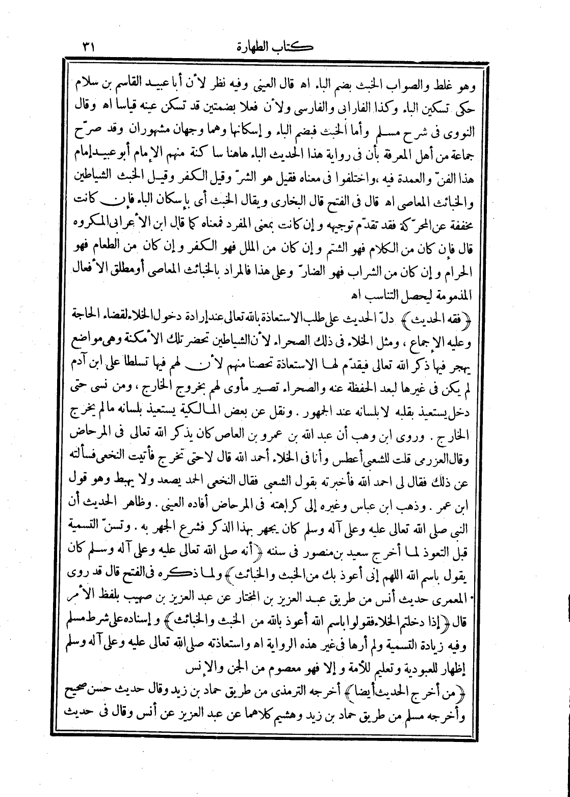 (فقه الحديث) دلّ الحديث علي طلب الاستعاذة بالله تعالى عند إرادة دخول الخلاء لقضاء الحاجة وعليه الإجماع، ومثل الخلاء في ذلك الصحراء لأن الشياطين تحضر تلك الأمكنة وهى مواضع يهجر فيها ذكر الله تعالى فيقدّم لها الاستعاذة تحصنا منهم لأن لهم فيها تسلطا على ابن آدم لم يكن في غيرها لبعد الحفظة عنه والصحراء تصير مأوى لهم بخروج الخارج، ومن نسى حتى دخل يستعيذ بقلبه لا بلسانه عند الجمهور. ونقل عن بعض المالكية يستعيذ بلسانه ما لم يخرج الخارج. وروى ابن وهب أن عبد الله ابن عمرو بن العاص كان يذكر الله تعالى في المرحاض وقال العزرمى قلت للشعبى أعطس وأنا في الخلاء أحمد الله قال لا حتى تخرج فأتيت النخعى فسألته عن ذلك فقال لى أحمد الله فأخبرته بقول الشعبى فقال النخعى الحمد يصعد ولا يهبط وهو قول ابن عمر. وذهب ابن عباس وغيره إلى كراهته في المرحاض أفاده العينى. وظاهر الحديث أن النبى صلى الله تعالى عليه وعلى آله وسلم كان يجهر بهذا الذكر فشرع الجهر به. وتسنّ التسمية قبل التعوذ لما أخرج سعيد بن منصور في سننه (أنه صلى الله تعالى عليه وعلى آله وسلم كان يقول باسم الله اللهم إنى أعوذ بك من الخبث والخبائث) ولما ذكره في الفتح قال قد روى المعمرى حديث أنس من طريق عبد العزيز بن المختار عن عبد العزيز بن صهيب بلفظ الأمر قال (إذا دخلتم الخلاء فقولوا باسم الله أعوذ بالله من الخبث والخبائث) وإسناده على شرط مسلم وفيه زيادة التسمية ولم أرها في غير هذه الرواية اهـ واستعاذته صلى الله تعالى عليه وعلى آله وسلم إظهار للعبودية وتعليم للأمة وإلا فهو معصوم من الجن والإنس