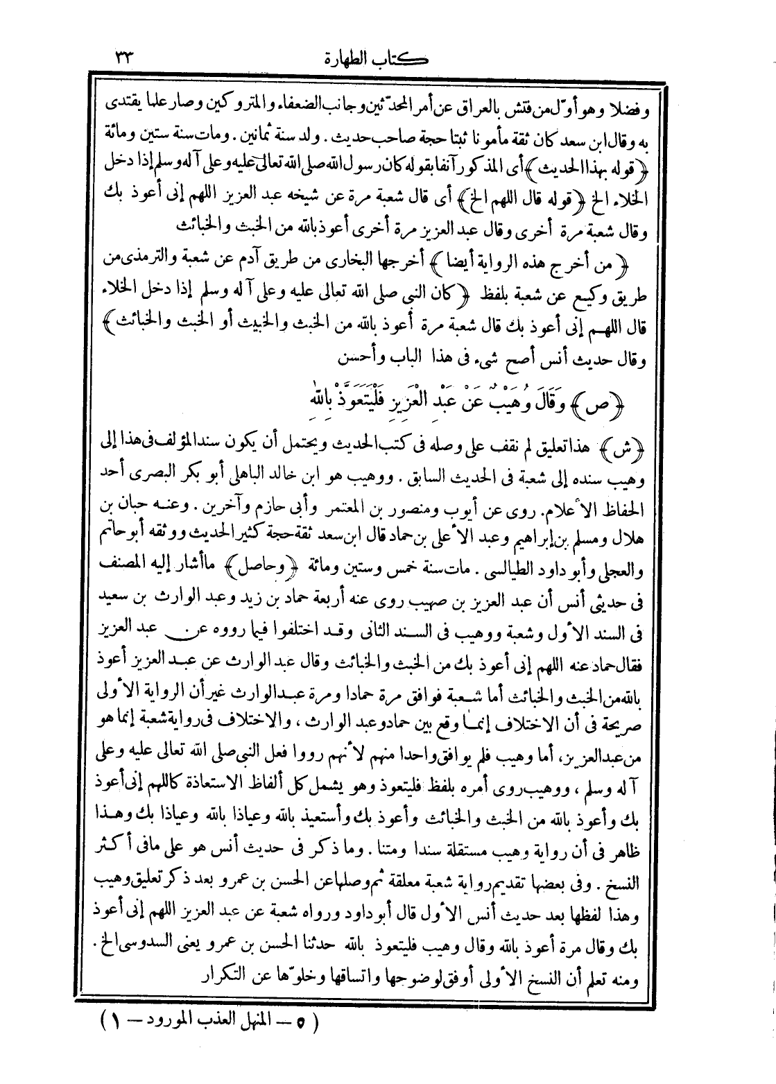 (ش) هذا تعليق لم نقف على وصله في كتب الحديث ويحتمل أن يكون سند المؤلف في هذا إلى وهيب سنده إلى شعبة في الحديث السابق. ووهيب هو ابن خالد الباهلى أبو بكر البصرى أحد الحفاظ الأعلام. روى عن أيوب ومنصور بن المعتمر وأبى حازم وآخرين. وعنه حبان ابن هلال ومسلم بن إبراهيم وعبد الأعلى بن حماد قال ابن سعد ثقة حجة كثير الحديث ووثقه أبو حاتم والعجلى وأبو داود الطيالسى. مات سنة خمس وستين ومائة (وحاصل) ما أشار إليه المصنف في حديثى أنس أن عبد العزيز بن صهيب روى عنه أربعة حماد بن زيد وعبد الوارث بن سعيد في السند الأول وشعبة ووهيب في السند الثانى وقد اختلفوا فيما رووه عن عبد العزيز فقال حماد عنه اللهم إنى أعوذ بك من الخبث والخبائث وقال عبد الوارث عن عبد العزيز أعوذ بالله من الخبث والخبائث أما شعبة فوافق مرة حماده ومرة عبد الوارث غير أن الرواية الأولى صريحة في أن الاختلاف إنما وقع بين حماد وعبد الوارث، والاختلاف في رواية شعبة إنما هو من عبد العزيز، أما وهيب فلم يوافق واحدا منهم لأنهم رووا فعل النبى صلى الله تعالى عليه وعلى آله وسلم، ووهيب روى أمره بلفظ فليتعوذ وهو يشمل كل ألفاظ الاستعاذة كاللهم إنى أعوذ بك وأعوذ بالله من الخبث والخبائث وأعوذ بك وأستعيذ بالله وعياذا بالله وعياذا بك وهذا ظاهر في أن رواية وهيب مستقلة سندا ومتنا. وما ذكر في حديث أنس هو على ما في أكثر النسخ. وفى بعضها تقديم رواية شعبة معلقة ثم وصلها عن الحسن بن عمرو بعد ذكر تعليق وهيب وهذا لفظها بعد حديث أنس الأول قال أبو داود ورواه شعبة عن عبد العزيز اللهم إنى أعوذ بك وقال مرة أعوذ بالله وقال وهيب فليتعوذ بالله حدثنا الحسن بن عمرو يعنى السدوسى الخ. ومنه تعلم أن النسخ الأولى أوفق لوضوحها واتساقها وخلوّها عن التكرار