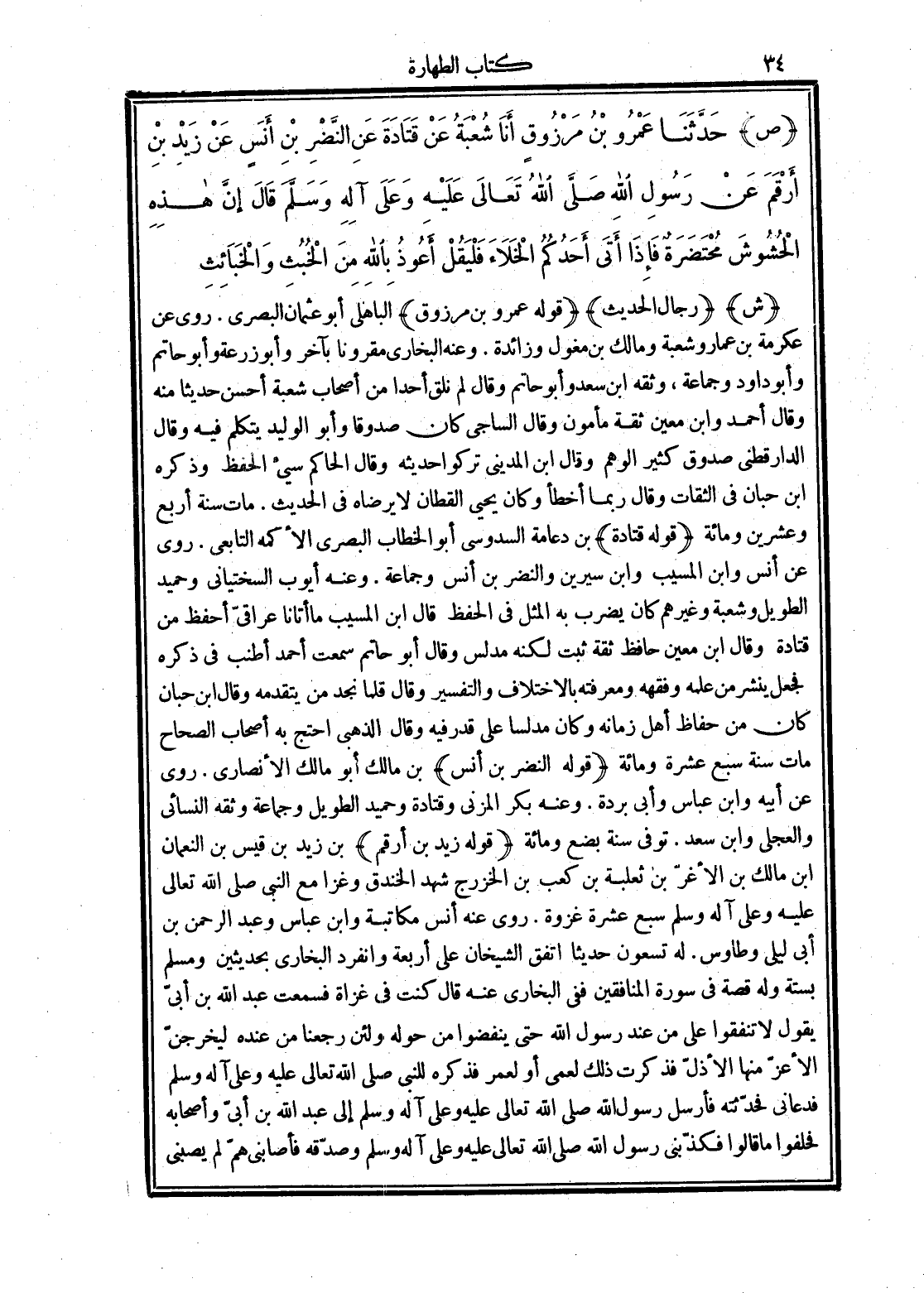 (ص) حَدَّثَنَا عَمْرُو بْنُ مَرْزُوقٍ، أَنَا شُعْبَةُ، عَنْ قَتَادَةَ، عَنِ النَّضِرِ بْنِ أَنَسٍ، عَنْ زَيْدِ بْنِ أَرْقَمَ، عَنْ رَسُولِ اللَّهِ صَلَّى اللهُ تَعَالَى عَلَيْهِ وَعَلَى آلِهِ وَسَلَّمَ قَالَ: " إِنَّ هَذِهِ الْحُشُوشَ مُحْتَضَرَةٌ، فَإِذَا أَتَى أَحَدُكُمُ الْخَلَاءَ فَلْيَقُلْ: أَعُوذُ بِاللَّهِ مِنَ الْخُبُثِ وَالْخَبَائِثِ "