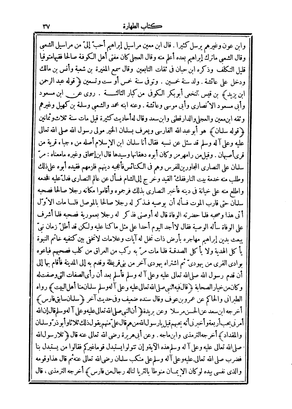 (قوله سلمان) هو أبو عبد الله الفارسى ويعرف بسلمان الخير مولى رسول الله صلى الله تعالى عليه وعلى آله وسلم قد سئل عن نسبه فقال أنا سلمان ابن الإسلام أصله من "جبا" قرية من قرى أصبهان. وقيل من رامهرمز وكان أبوه دهقانها وسيدها قال ابن إسحاق وغيره ما معناه: مرّ سلمان على النصارى المجاورين للفرس وهم في الكنائس فأعجبه دينهم فلزمهم فقيده أبوه على ذلك وطلب منه خدمة بيت النار ففكّ القيد وخرج إلى الشام فسأل عن عالم النصارى فدلّ عليه فخدمه واطلع منه على خيانة في دينه فأخبر النصارى بذلك فرجموه وأقاموا مكانه رجلا صالحا فصحبه سلمان حتى قارب الموت فسأله أن يوصيه فذكر له رجلا صالحا بالموصل فلما مات الأوّل أى هذا وصحبه فلما حضرته الوفاة قال له أوصنى فذكر له رجلا بعمورية فصحبه فلما أشرف على الوفاة سأله الوصية فقال لا أجد اليوم أحدا على مثل ما كنا عليه ولكن قد أطلّ زمان نبيّ يبعث بدين إبراهيم مهاجره بأرض ذات نخل له آيات وعلامات لا تخفى بين كتفيه خاتم النبوة يأكل الهدية ولا يأكل الصدقة فلما مات مرّ به ركب من العراق من كلب فصحهم فباعوه بوادى القرى من يهودىّ ثم اشتراه يهودى آخر من بنى قريظة وقدم به إلى المدينة فأقام بها إلى أن قدم رسول الله صلى الله تعالى عليه وعلى آله وسلم فأسلم بعد أن رأى الصفات التى وصفت له وكان من خيار الصحابة (قال فيه النبى صلى الله تعالى عليه وعلى آله وسلم سلمان منا أهل البيت) رواه الطبرانى والحاكم عن عمرو بن عوف وقال سنده ضعيف وفى حديث آخر (سلمان سابق فارس) أخرجه ابن سعد عن الحسن مرسلا وعن بريدة (أن النبى صلى الله تعالى علية وعلى آله وسلم قال إن الله أمرنى بحب أربعة وأخبرنى أنه يحبهم قيل يا رسول الله من هم قال علىّ منهم يقول ذلك ثلاثا وأبو ذرّ وسلمان والمقداد) أخرجه الترمذى وابن ماجه. وعن أبى هريرة رَضِيَ اللَّهُ تَعَالَى عَنْهُ قال (تلا رسول الله صلى الله تعالى عليه وعلى آله وسلم هذه الآية وإن تتولوا يستبدل قوما غيركم فقالوا من يستبدل بنا فضرب صلى الله تعالى عليه وعلى آله وسلم على منكب سلمان رَضِيَ اللَّهُ تَعَالَى عَنْهُ ثم قال هذا وقومه والذى نفسى بيده لو كان الإيمان منوطا بالثريا لناله رجال من فارس) أخرجه الترمذى، قال