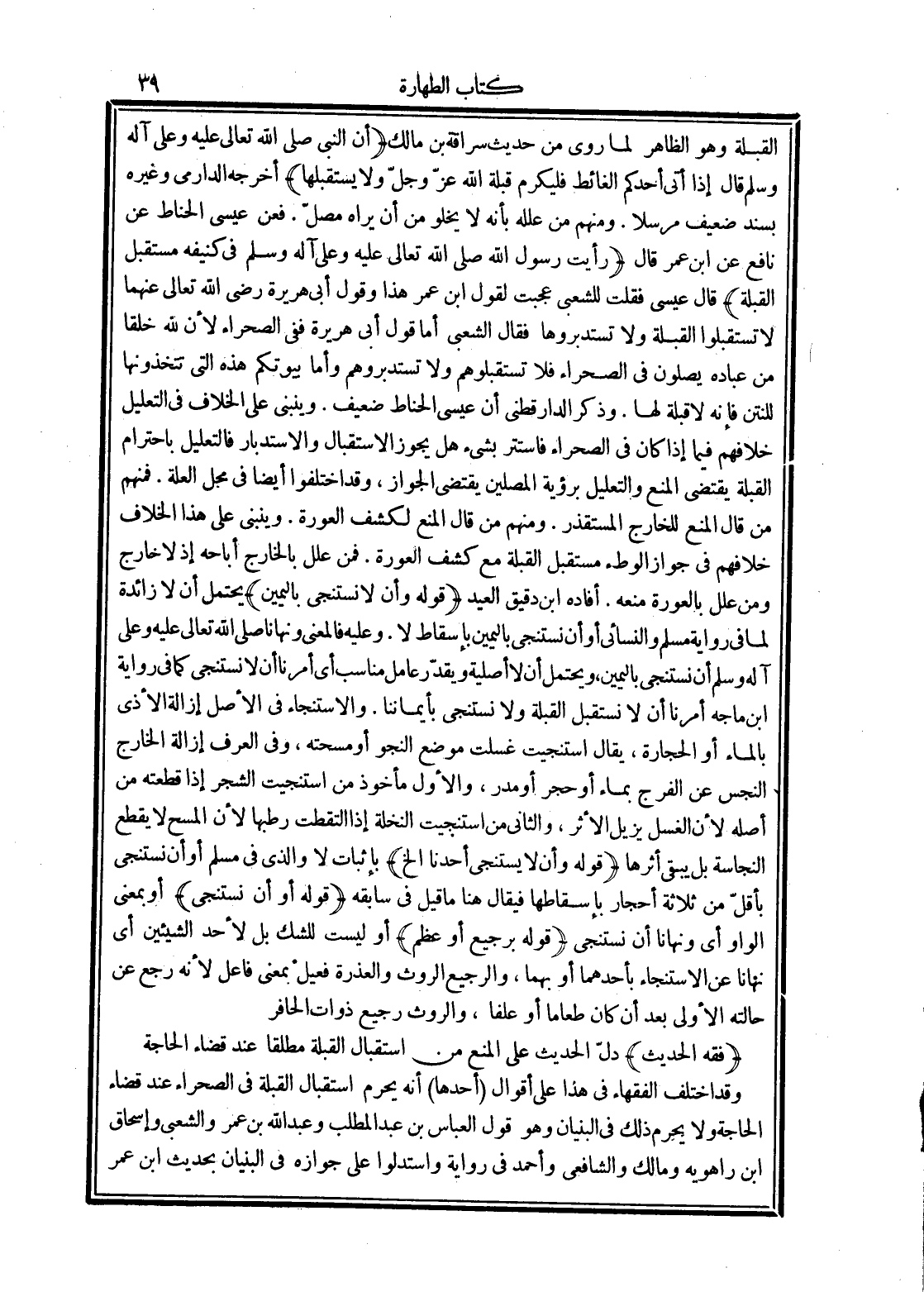 القبلة وهو الظاهر لما روى من حديث سراقة بن مالك (أن النبى صلى الله تعالى عليه وعلى آله وسلم قال إذا آتى أحدكم الغائط فليكرم قبلة الله عزّ وجلّ ولا يستقبلها) أخرجه الدارمى وغيره بسند ضعيف مرسلا. ومنهم من علله بأنه لا يخلو من أن يراه مصلّ. فعن عيسى الحناط عن نافع عن ابن عمر قال (رأيت رسول الله صلى الله تعالى عليه وعلى آله وسلم في كنيفه مستقبل القبلة) قال عيسى فقلت للشعبى عجبت لقول ابن عمر هذا وقول أبى هريرة رَضِيَ اللَّهُ تَعَالَى عَنْهُما لا تستقبلوا القبلة ولا تستدبروها فقال الشعبى أما قول أبى هريرة ففي الصحراء لأن لله خلقا من عباده يصلون في الصحراء فلا تستقبلوهم ولا تستدبروهم وأما بيوتكم هذه التى تتخذونها للنتن فإنة لا قبلة لها. وذكر الدارقطنى أن عيسى الحناط ضعيف. وينبنى على الخلاف في التعليل خلافهم فيما إذا كان في الصحراء فاستتر بشئ هل يجوز الاستقبال والاستدبار فالتعليل باحترام القبلة يقتضى المنع والتعليل برؤية المصلين يقتضى الجواز، وقد اختلفوا أيضا في محل العلة. فمنهم من قال المنع للخارج المستقذر. ومنهم من قال المنع لكشف العورة. وينبنى على هذا الخلاف خلافهم في جواز الوطء مستقبل القبلة مع كشف العورة. فمن علل بالخارج أباحه إذ لا خارج ومن علل بالعورة منعه. أفاده ابن دقيق العيد