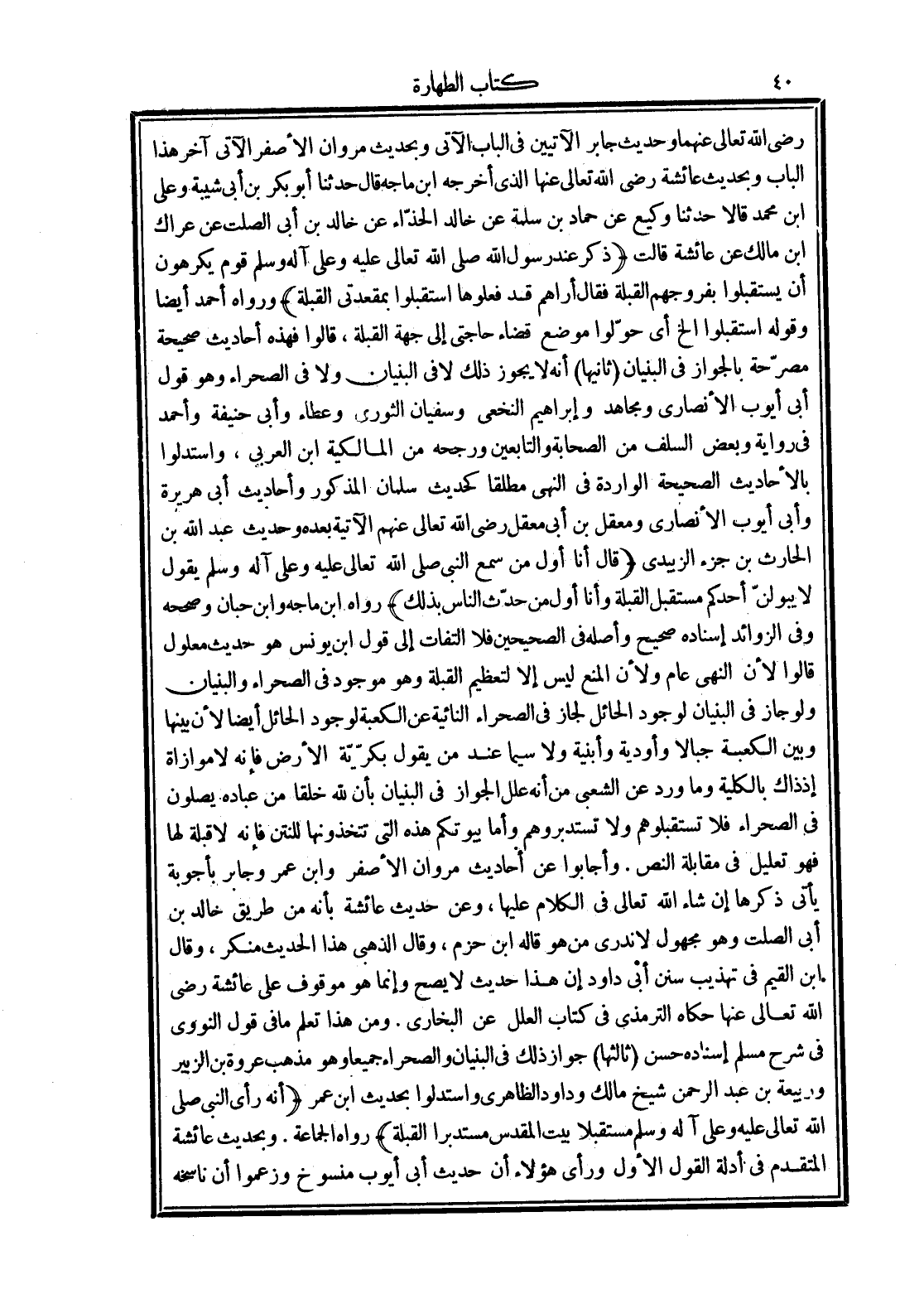 رَضِيَ اللَّهُ تَعَالَى عَنْهُما وحديث جابر الآتيين في الباب الآتى وبحديث مروان الأصفر الآتى آخر هذا الباب وبحديث عائشة رَضِيَ اللَّهُ تَعَالَى عَنْهُا الذى أخرجه ابن ماجة قال حدثنا أبو بكر بن أبى شيبة وعلى ابن محمد قالا حدثنا وكيع عن حماد بن سلمة عن خالد الحذّاء عن خالد بن أبى الصلت عن عراك ابن مالك عن عائشة قالت (ذكر عند رسول الله صلى الله تعالى عليه وعلى آله وسلم قوم يكرهون أن يستقبلوا بفروجهم القبلة فقال أراهم قد فعلوها استقبلوا بمقعدتى القبلة) ورواه أحمد أيضا وقوله استقبلوا الخ أى حوّلوا موضع قضاء حاجتى إلى جهة القبلة، قالوا فهذه أحاديث صحيحة مصرّحة بالجواز في البنيان (ثانيها) أنه لا يجوز ذلك لا في البنيان ولا في الصحراء وهو قول أبى أيوب الأنصارى ومجاهد وإبراهيم النخعى وسفيان الثورى وعطاء وأبى حنيفة وأحمد في رواية وبعض السلف من الصحابة والتابعين ورجحه من المالكية ابن العربى، واستدلوا بالأحاديث الصحيحة الواردة في النهى مطلقا كحديث سلمان المذكور وأحاديث أبى هريرة وأبى أيوب الأنصارى ومعقل بن أبى معقل رَضِيَ اللَّهُ تَعَالَى عَنْهُم الآتية بعده وحديث عبد الله بن الحارث بن جزء الزبيدى (قال أنا أول من سمع النبى صلى الله تعالى عليه وعلى آله وسلم يقول لا يبولنّ أحدكم مستقبل القبلة وأنا أول من حدّث الناس بذلك) رواه ابن ماجه وابن حبان وصححه وفى الزوائد إسناده صحيح وأصله في الصحيحين فلا التفات إلى قول ابن يونس هو حديث معلول قالوا لأن النهى عام ولأن المنع ليس إلا لتعظيم القبلة وهو موجود في الصحراء والبنيان ولو جاز في البنيان لوجود الحائل لجاز في الصحراء النائية عن الكعبة لوجود الحائل أيضا لأن بينها وبين الكعبة جبالا وأودية وأبنية ولا سيما عند من يقول بكرّيّة الأرض فإنه لا موازاة إذ ذاك بالكلية وما ورد عن الشعبى من أنه علل الجواز في البنيان بأن لله خلقا من عباده يصلون في الصحراء فلا تستقبلوهم ولا تستدبروهم وأما بيوتكم هذه التى تتخذونها للنتن فإنه لا قبلة لها فهو تعليل في مقابلة النص. وأجابوا عن أحاديث مروان الأصفر وابن عمر وجابر بأجوبة يأتى ذكرها إن شاء الله تعالى في الكلام عليها، وعن حديث عائشة بأنه من طريق خالد بن أبى الصلت وهو مجهول لا ندرى من هو قاله ابن حزم، وقال الذهبي هذا الحديث منكر، وقال ابن القيم في تهذيب سنن أبى داود إن هذا حديث لا يصح وإنما هو موقوف على عائشة رَضِيَ اللَّهُ تَعَالَى عَنْهُا حكاه الترمذى في كتاب العلل عن البخارى. ومن هذا تعلم ما في قول النووى في شرح مسلم إسناده حسن (ثالثها) جواز ذلك في البنيان والصحراء جميعا وهو مذهب عروة بن الزبير وربيعة بن عبد الرحمن شيخ مالك وداود الظاهرى واستدلوا بحديث ابن عمر (أنه رأى النبى صلى الله تعالى عليه وعلى آله وسلم مستقبلا بيت المقدس مستدبرا القبلة) رواه الجماعة. وبحديث عائشة المتقدم في أدلة القول الأول ورأى هؤلاء أن حديث أبى أيوب منسوخ وزعموا أن ناسخه