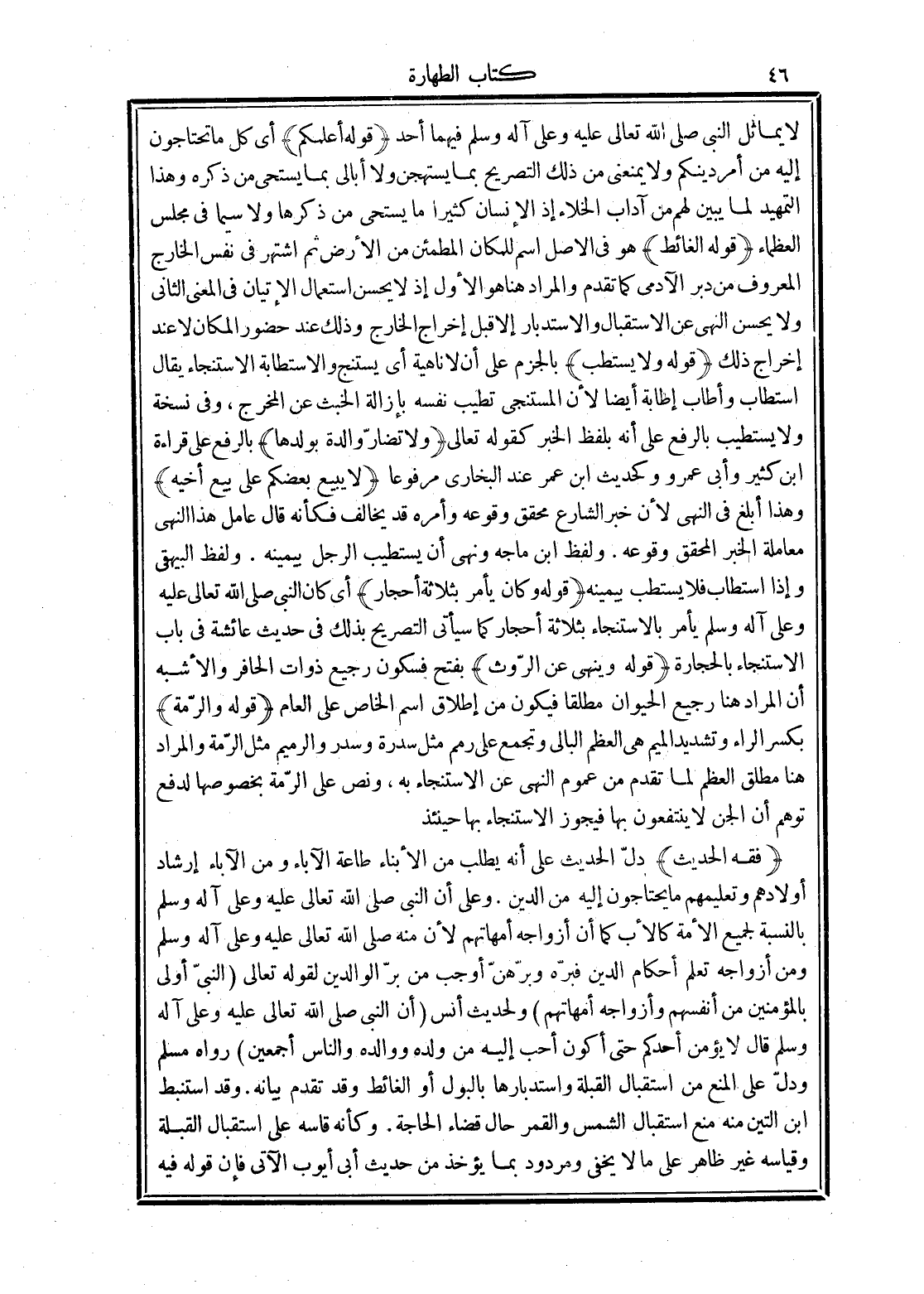 (قوله والرّمة) بكسر الراء وتشديد الميم هي العظم البالى وتجمع على رمم مثل سدرة وسدر والرميم مثل الرّمة والمراد هنا مطلق العظم لما تقدم من عموم النهى عن الاستنجاء به، ونص على الرّمة بخصوصها لدفع توهم أن الجن لا ينتفعون بها فيجوز الاستنجاء بها حينئذ (فقه الحديث) دلّ الحديث على أنه يطلب من الأبناء طاعة الآباء ومن الآباء إرشاد أولادهم وتعليمهم ما يحتاجون إليه من الدين. وعلى أن النبى صلى الله تعالى عليه وعلى آله وسلم بالنسبة لجميع الأمة كالأب كما أن أزواجه أمهاتهم لأن منه صلى الله تعالى عليه وعلى آله وسلم ومن أزواجه تعلم أحكام الدين فبرّه وبرّهنّ أوجب من برّ الوالدين لقوله تعالى (النبىّ أولى بالمؤمنين من أنفسهم وأزواجه أمهاتهم) ولحديث أنس (أن النبى صلى الله تعالى عليه وعلى آله وسلم قال لا يؤمن أحدكم حتى أكون أحب إليه من ولده ووالده والناس أجمعين) رواه مسلم ودلّ على المنع من استقبال القبلة واستدبارها بالبول أو الغائط وقد تقدم بيانه. وقد استنبط ابن التين منه منع استقبال الشمس والقمر حال قضاء الحاجة. وكأنه قاسه على استقبال القبلة وقياسه غير ظاهر على ما لا يخفى ومردود بما يؤخذ من حديث أبى أيوب إلآتى فإن قوله فيه
