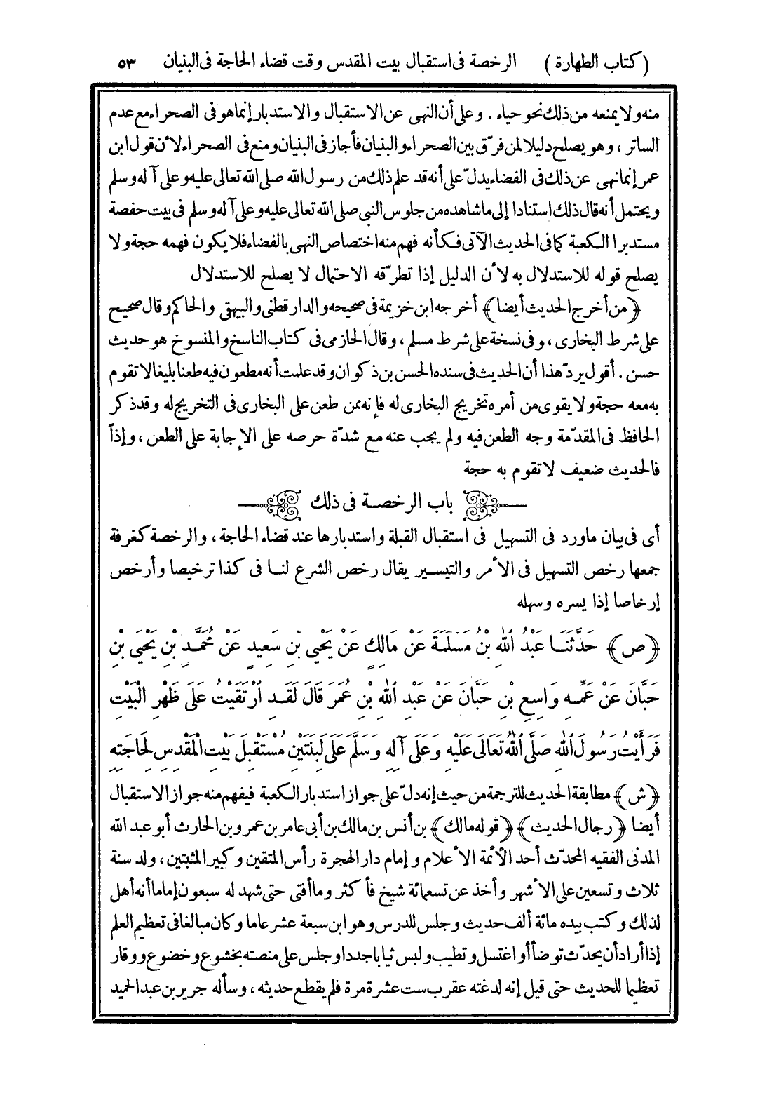 (ص) حَدَّثَنَا عَبْدُ اللَّهِ بْنُ مَسْلَمَةَ، عَنْ مَالِكٍ، عَنْ يَحْيَى بْنِ سَعِيدٍ، عَنْ مُحَمَّدِ بْنِ يَحْيَى بْنِ حَبَّانَ، عَنْ عَمِّهِ وَاسِعِ بْنِ حَبَّانَ، عَنْ عَبْدِ اللَّهِ بْنِ عُمَرَ، قَالَ: لَقَدْ ارْتَقَيْتُ عَلَى ظَهْرِ الْبَيْتِ، «فَرَأَيْتُ رَسُولَ اللَّهِ صَلَّى اللهُ تَعَالَى عَلَيْهِ وَعَلَى آلِهِ وَسَلَّمَ عَلَى لَبِنَتَيْنِ مُسْتَقْبِلَ بَيْتِ الْمَقْدِسِ لِحَاجَتِهِ»