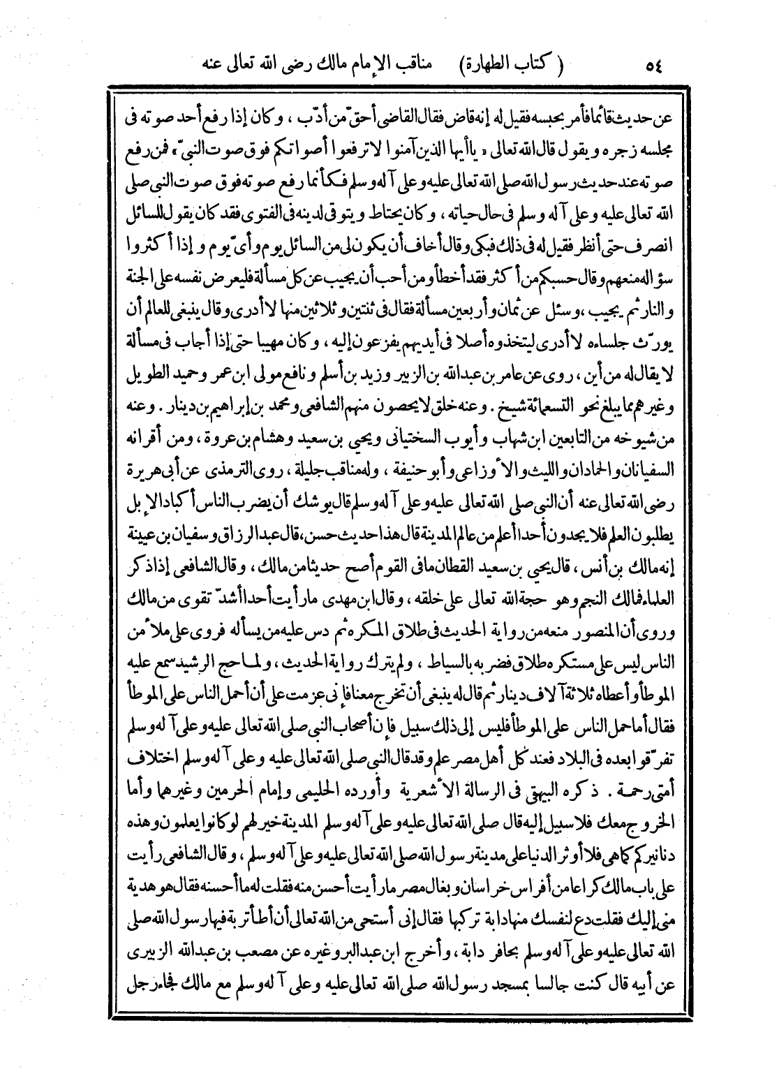 عن حديث قائما فأمر بحبسه فقيل له إنه قاض فقال القاضى أحقّ من أدّب، وكان إذا رفع أحد صوته في مجلسه زجره ويقول قال الله تعالى "يا أيها الذين آمنوا لا ترفعوا أصواتكم فوق صوت النبىّ" فمن رفع صوته عند حديث رسول الله صلى الله تعالى عليه وعلى آله وسلم فكأنما رفع صوته فوق صوت النبى صلى الله تعالى عليه وعلى آله وسلم في حال حياته، وكان يحتاط ويتوقى لدينه في الفتوى فقد كان يقول للسائل انصرف حتى أنظر فقيل له في ذلك فبكى وقال أخاف أن يكون لى من السائل يوم وأىّ يوم وإذا أكثروا سؤاله منعهم وقال حسبكم من أكثر فقد أخطأ ومن أحب أن يجيب عن كل مسألة فليعرض نفسه على الجنة والنار ثم يجيب، وسئل عن ثمان وأربعين مسألة فقال في ثنتين وثلاثين منها لا أدرى وقال ينبغى للعالم أن يورّث جلساءه لا أدرى ليتخذوه أصلا في أيديهم يفزعون إليه، وكان مهيبا حتى إذا أجاب في مسألة لا يقال له من أين، روى عن عامر بن عبد الله بن الزبير وزيد بن أسلم ونافع مولى ابن عمر وحميد الطويل وغيرهم مما يبلغ نحو التسعمائة شيخ. وعنه خلق لا يحصون منهم الشافعى ومحمد بن إبراهيم بن دينار. وعنه من شيوخه من التابعين ابن شهاب وأيوب السختيانى ويحيى بن سعيد وهشام بن عروة، ومن أقرانه السفيانان والحمادان والليث والأوزاعي وأبو حنيفة، وله مناقب جليلة، روى الترمذى عن أبى هريرة رَضِيَ اللَّهُ تَعَالَى عَنْهُ أن النبى صلى الله تعالى عليه وعلى آله وسلم قال يوشك أن يضرب الناس أكباد الإبل يطلبون العلم فلا يجدون أحدا أعلم من عالم المدينة قال هذا حديث حسن، قال عبد الرزاق وسفيان بن عيينة إنه مالك بن أنس، قال يحيى بن سعيد القطان ما في القوم أصح حديثا من مالك، وقال الشافعى إذا ذكر العلماء فمالك النجم وهو حجة الله تعالى على خلقه، وقال ابن مهدى ما رأيت أحدا أشدّ تقوى من مالك وروى أن المنصور منعه من رواية الحديث في طلاق المكره ثم دس عليه من يسأله فروى على ملأ من الناس ليس على مستكره طلاق فضربه بالسياط، ولم يترك رواية الحديث، ولما حج الرشيد سمع عليه الموطأ وأعطاه ثلاثة آلاف دينار ثم قال له ينبغى أن تخرج معنا فإنى عزمت على أن أحمل الناس على الموطأ فقال أما حمل الناس على الموطأ فليس إلى ذلك سبيل فإن أصحاب النبى صلى الله تعالى عليه وعلى آله وسلم تفرّقوا بعده في البلاد فعند كل أهل مصر علم وقد قال النبى صلى الله تعالى عليه وعلى آله وسلم اختلاف أمتى رحمة. ذكره البيهقى في الرسالة الأشعرية وأورده الحليمى وإمام الحرمين وغيرهما وأما الخروج معك فلا سبيل إليه قال صلى الله تعالى عليه وعلى آله وسلم المدينة خير لهم لو كانوا يعلمون وهذه دنانيركم كما هي فلا أوثر الدنيا على مدينة رسول الله صلى الله تعالى عليه وعلى اله وسلم، وقال الشافعى رأيت على باب مالك كراعا من أفراس خراسان وبغال مصر ما رأيت أحسن منه فقلت له ما أحسنه فقال هو هدية منى إليك فقلت دع لنفسك منها دابة تركبها فقال إنى أستحى من الله تعالى أن أطأ تربة فيها رسول الله صلى الله تعالى عليه وعلى آله وسلم بحافر دابة، وأخرج ابن عبد البر وغيره عن مصعب بن عبد الله الزبيرى عن أبيه قال كنت جالسا بمسجد رسول الله صلى الله تعالى عليه وعلى آله وسلم مع مالك فجاء رجل