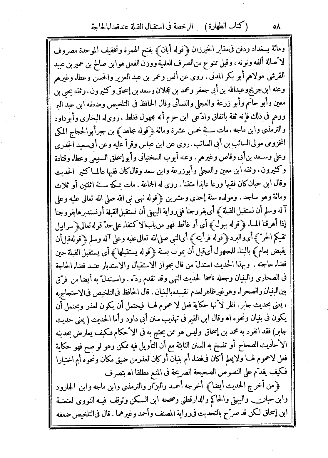 (قوله يستقبلها) أى يستقبل القبلة حين قضاء حاجته. وبهذا الحديث استدلّ من قال بجواز الاستقبال والاستدبار عند قضاء الحاجة في الصحارى والبنيان وجعله ناسخا لحديث النهى وقد تقدم ردّه. واستدلّ به أيضا من فرّق بين البنيان والصحراء وهو غير ظاهر لعدم تقييده بالبنيان. قال الحافظ في التلخيص في الاحتجاج به "يعنى بحديث جابر" نظر لأنها حكاية فعل لا عموم لها فيحتمل أن يكون لعذر ويحتمل أن يكون في بنيان ونحوه اهـ وقال ابن القيم في تهذيب سنن أبى داود وأما الحديث (يعنى حديث جابر) فقد انفرد به محمد بن إسحاق وليس هو ممن يحتج به في الأحكام فكيف يعارض بحديثه الأحاديث الصحاح أو تنسخ به السنن الثابتة مع أن التأويل فيه ممكن وهو لو صح فهو حكاية فعل لا عوم لها ولا يعلم أكان في فضاء أم بنيان أو كان لعذر من ضيق مكان ونحوه أم اختيارا فكيف يقدّم على النصوص الصحيحة الصريحه في المنع مطلقا اهـ بتصرف (من أخرج الحديث أيضا) أخرجه أحمد والبزّار والترمذى وابن ماجه وابن الجارود وابن حبان والبيهقى والحاكم والدارقطنى وصححه ابن السكن وتوقف فيه النووى لعنعنة ابن إسحاق لكن قد صرّح بالتحديث في رواية المصنف وأحمد وغيرهما. قال في التلخيص ضعفه