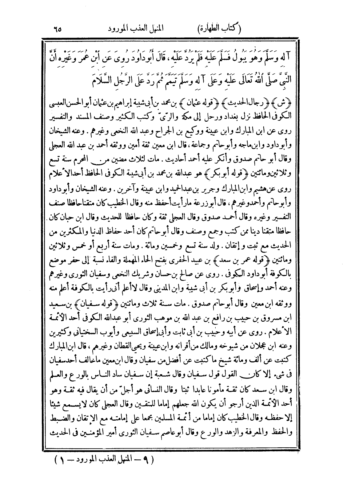 (قوله عثمان) بن محمد بن أبى شيبة إبراهيم بن عثمان أبو الحسن العبسى الكوفى الحافظ نزل بغداد ورحل إلى مكة والرّىّ. وكتب الكثير وصنف المسند والتفسير روى عن ابن المبارك وابن عيينة ووكيع بن الجراح وعبد الله النخعى وغيرهم. وعنه الشيخان وأبو داود وابن ماجه وأبو حاتم وجماعة، قال ابن معين ثقة أمين ووثقه أحمد بن عبد الله العجلى وقال أبو حاتم صدوق وأنكر عليه أحمد أحاديث. مات لثلاث مضين من المحرم سنة تسع وثلاثين ومائتين