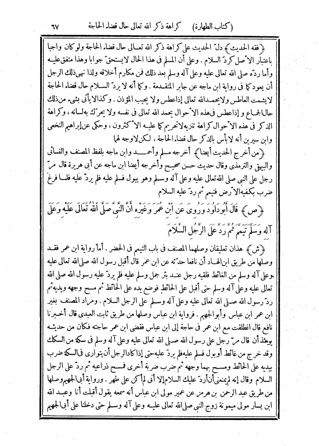 (فقه الحديث) دلّ الحديث على كراهة ذكر الله تعالى حال قضاء الحاجة ولو كان واجبا باعتبار الأصل كردّ السلام. وعلى أن المسلم في هذا الحال لا يستحقّ جوابا وهذا متفق عليه وأما ردّه صلى الله تعالى عليه وعلى آله وسلم بعد ذلك فمن مكارم أخلاقه ولذا نهى ذلك الرجل أن يعود كما في رواية ابن ماجه عن جابر المتقدمة. وكما أنه لا يردّ السلام حال قضاء الحاجة لا يشمت العاطس ولا يحمد الله تعالى إذا عطس ولا يجيب المؤذن. وكذا لا يأتى بشيء من ذلك حال الجماع وإذا عطس في هذه الأحوال يحمد الله تعالى في نفسه ولا يحرّك به لسانه، وكراهة الذكر في هذه الأحوال كراهة تنزيه لا تحريم كما عليه الأكثرون، وحكي عن إبراهيم النخعى وابن سيرين أنه لا بأس بالذكر حال قضاء الحاجة، لكن لا وجه لهما