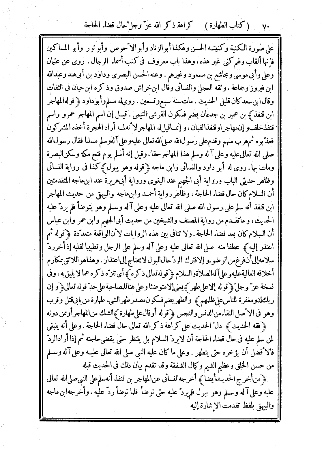 (فقه الحديث) دلّ الحديث على كراهة ذكر الله تعالى حال قضاء الحاجة. وعلى أنه ينبغى لمن سلم عليه في حال قضاء الحاجة أن لا يردّ السلام بل ينتظر حتى يقضى حاجته ثم إذا أراد الردّ فالأفضل أن يؤخره حتى يتطهر. وعلى ما كان عليه النبى صلى الله تعالى عليه وعلى آله وسلم من حسن الخلق وعظيم الشيم وكمال الشفقة وقد تقدم بيان ذلك في الحديث قبله
