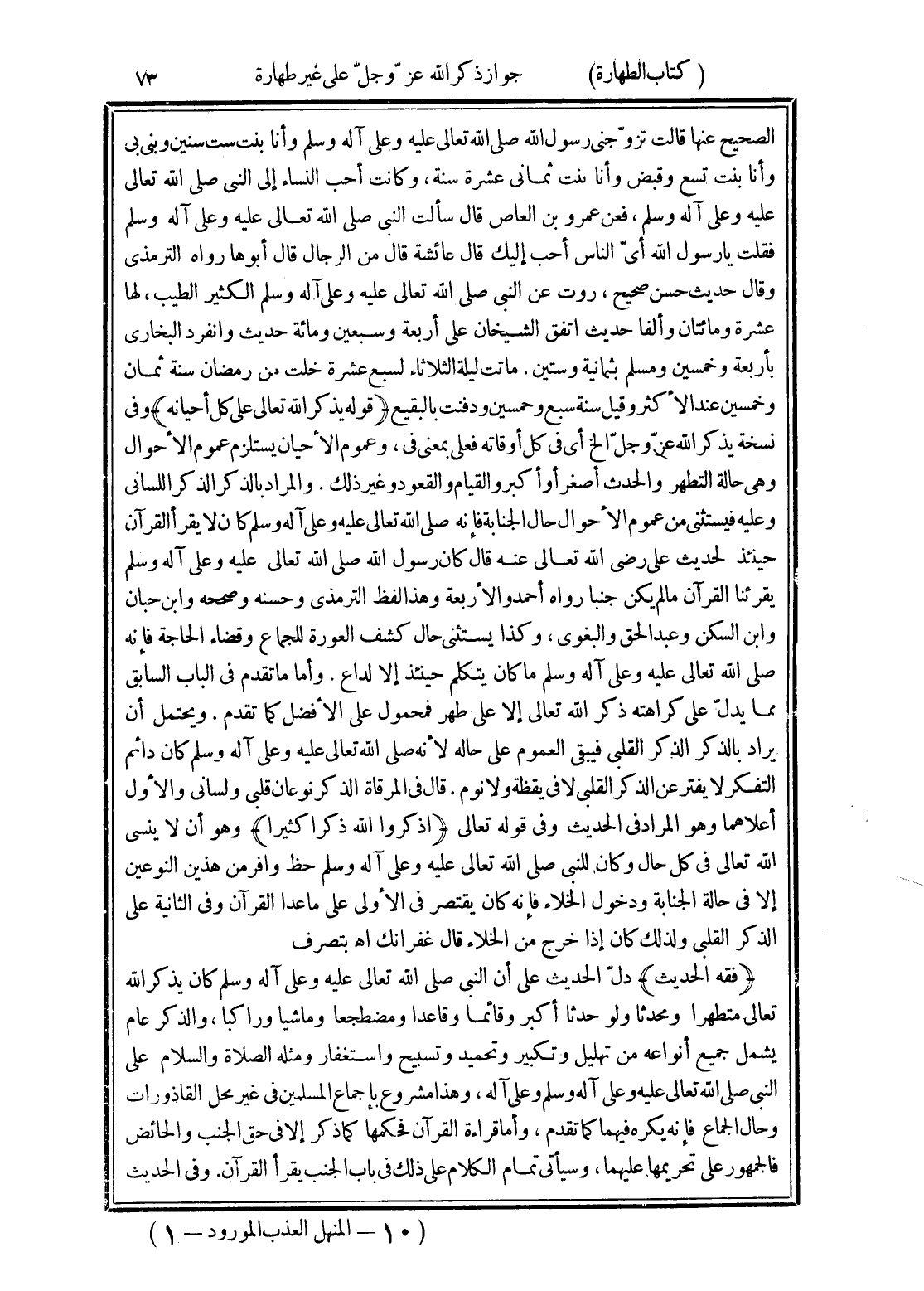 (فقه الحديث) دلّ الحديث على أن النبى صلى الله تعالى عليه وعلى آله وسلم كان يذكر الله تعالى متطهرا ومحدثا ولو حدثا أكبر وقائما وقاعدا ومضطجعا وماشيا وراكبا، والذكر عام يشمل جميع أنواعه من تهليل وتكبير وتحميد وتسبيح واستغفار ومثله الصلاة والسلام على النبى صلى الله تعالى عليه وعلى آله وسلم وعلى آله، وهذا مشروع بإجماع المسلمين من غير محل القاذورات وحال الجماع فإنه يكره فيهما كما تقدم، وأما قراءة القرآن فحكمها كما ذكر إلا في حق الجنب والحائض فالجمهور على تحريمها عليهما، وسيأتى تمام الكلام على ذلك في باب الجنب يقرأ القرآن. وفى الحديث