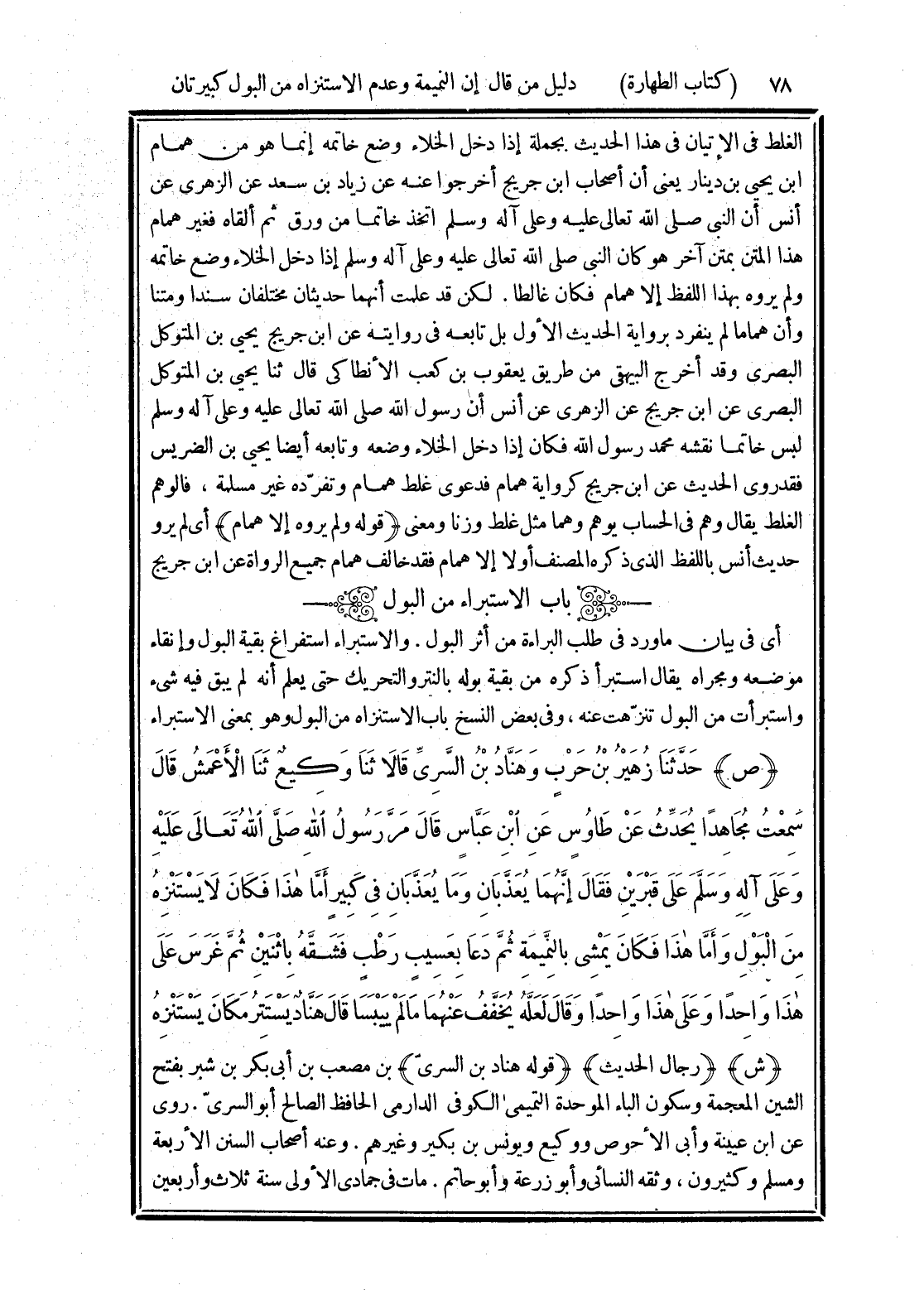(ص) حَدَّثَنَا زُهَيْرُ بْنُ حَرْبٍ، وَهَنَّادُ بْنُ السَّرِيِّ، قَالَا: ثَنَا وَكِيعٌ، ثَنَا الْأَعْمَشُ، قَالَ: سَمِعْتُ مُجَاهِدًا، يُحَدِّثُ عَنْ طَاوُسٍ، عَنِ ابْنِ عَبَّاسٍ، قَالَ: مَرَّ رَسُولُ اللَّهِ صَلَّى اللهُ تَعَالَى عَلَيْهِ وَعَلَى آلِهِ وَسَلَّمَ عَلَى قَبْرَيْنِ، فَقَالَ: " إِنَّهُمَا يُعَذَّبَانِ، وَمَا يُعَذَّبَانِ فِي كَبِيرٍ، أَمَّا هَذَا فَكَانَ لَا يَسْتَنْزِهُ مِنَ الْبَوْلِ، وَأَمَّا هَذَا فَكَانَ يَمْشِي بِالنَّمِيمَةِ، ثُمَّ دَعَا بِعَسِيبٍ رَطْبٍ فَشَقَّهُ بِاثْنَيْنِ، ثُمَّ غَرَسَ عَلَى هَذَا وَاحِدًا، وَعَلَى هَذَا وَاحِدًا، وَقَالَ: لَعَلَّهُ يُخَفَّفُ عَنْهُمَا مَا لَمْ يَيْبَسَا "، قَالَ هَنَّادٌ: يَسْتَتِرُ مَكَانَ يَسْتَنْزِهُ،